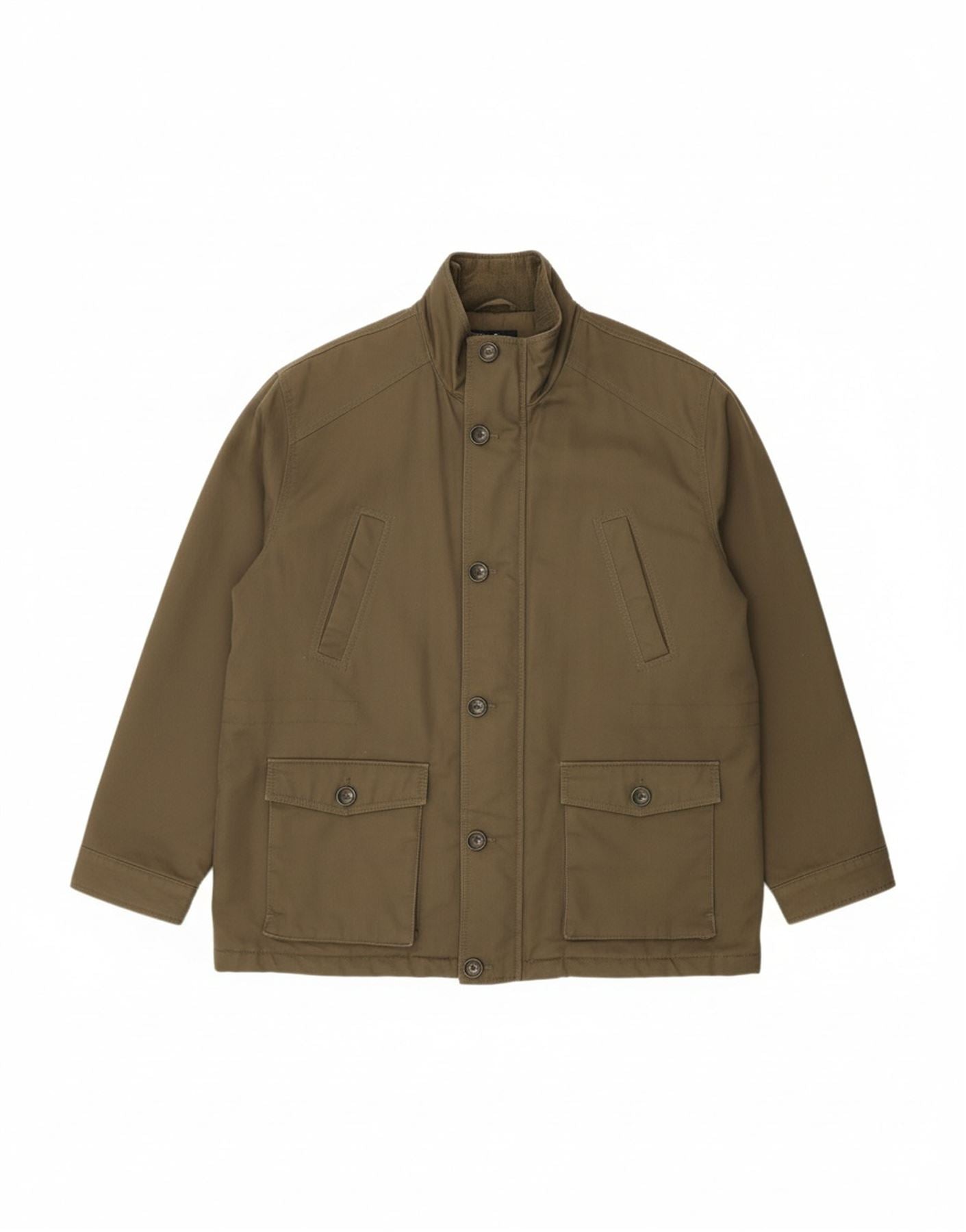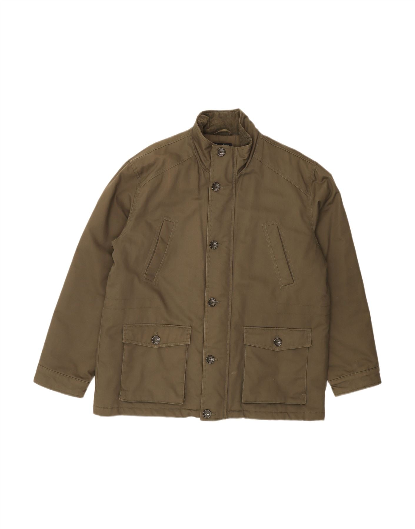 - AI Description: This James Pringle men's military jacket is crafted from robust khaki cotton. Its woven outer fabric offers a durable feel, while the padded lining ensures warmth. A classic collared neckline and long sleeves frame the design. It features a secure button closure and practical zip detail. Multiple pockets add utility. The regular fit balances structure with comfort, making it ideal for everyday wear.