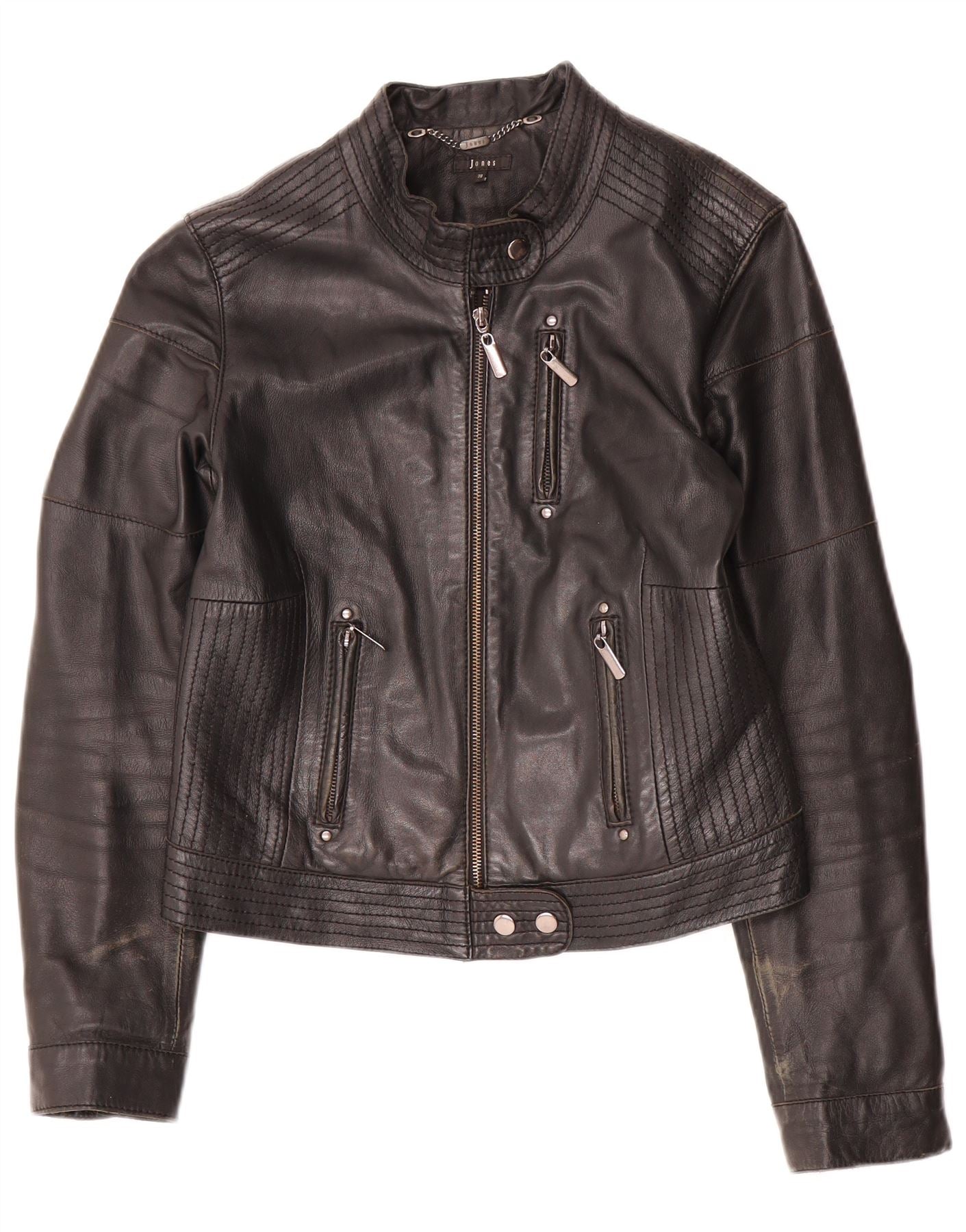 - Descripción de IA: Esta chaqueta motera para mujer Jones está confeccionada con cuero negro genuino y ofrece un acabado elegante y duradero. Presenta escote con cuello y manga larga. El corte entallado crea una silueta moderna. Un cierre de cremallera completo y múltiples bolsillos con cremallera añaden un estilo motero clásico. La chaqueta está completamente forrada para mayor comodidad y un interior refinado.