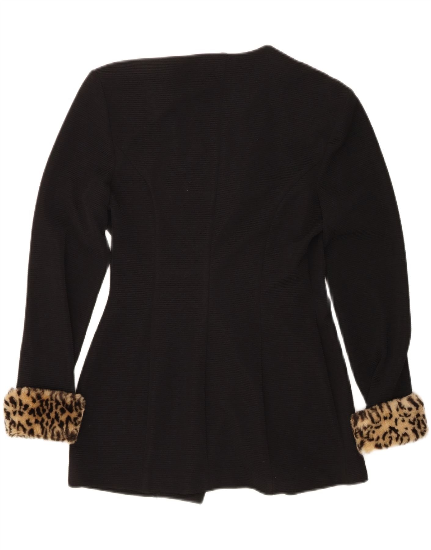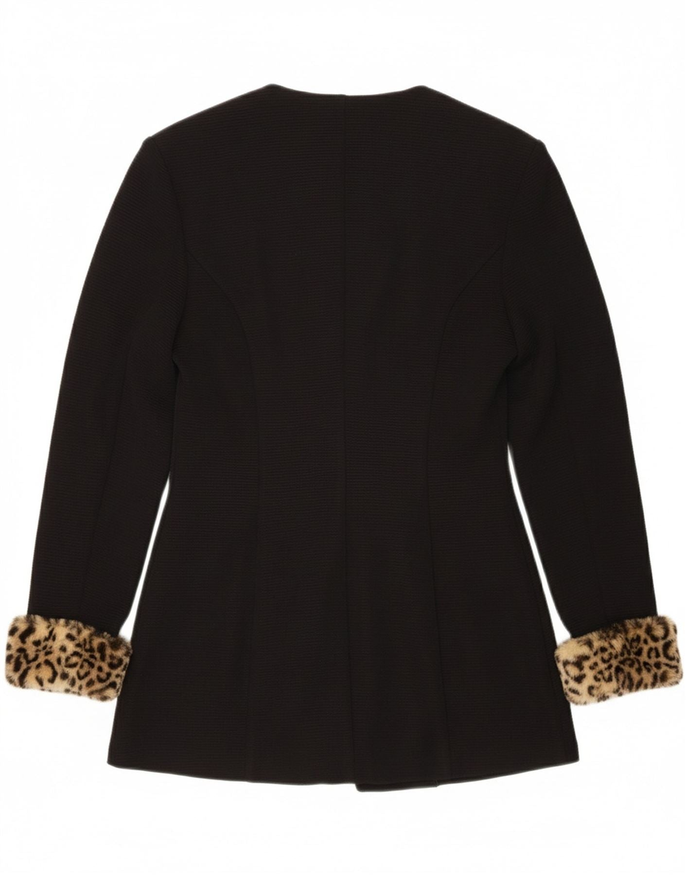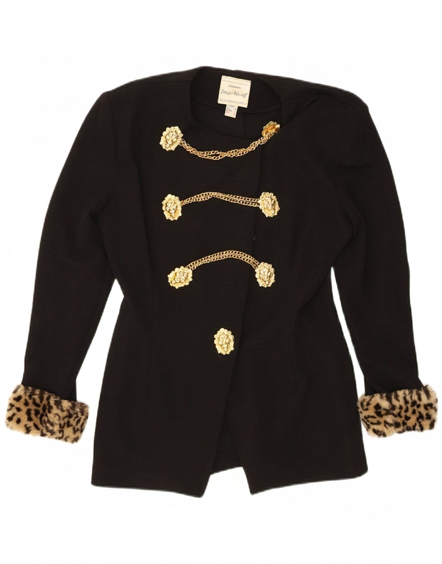 - AI Description: This Joseph Ribkoff women's blazer jacket is crafted from a refined black knit fabric. It features a sophisticated round neck and long cuffed sleeves. The double breasted style is enhanced by an asymmetric front closure with unique medallion accents. Luxurious faux fur detailing adds texture and elegance. Its regular fit offers a comfortable yet polished silhouette.