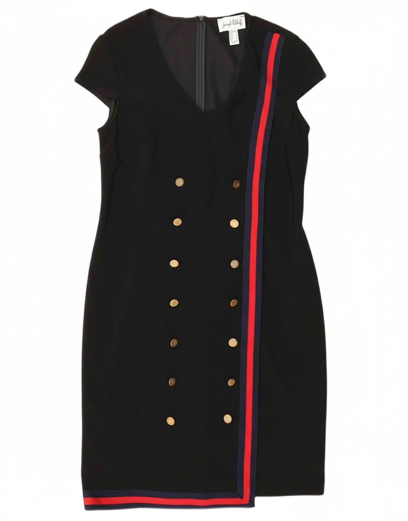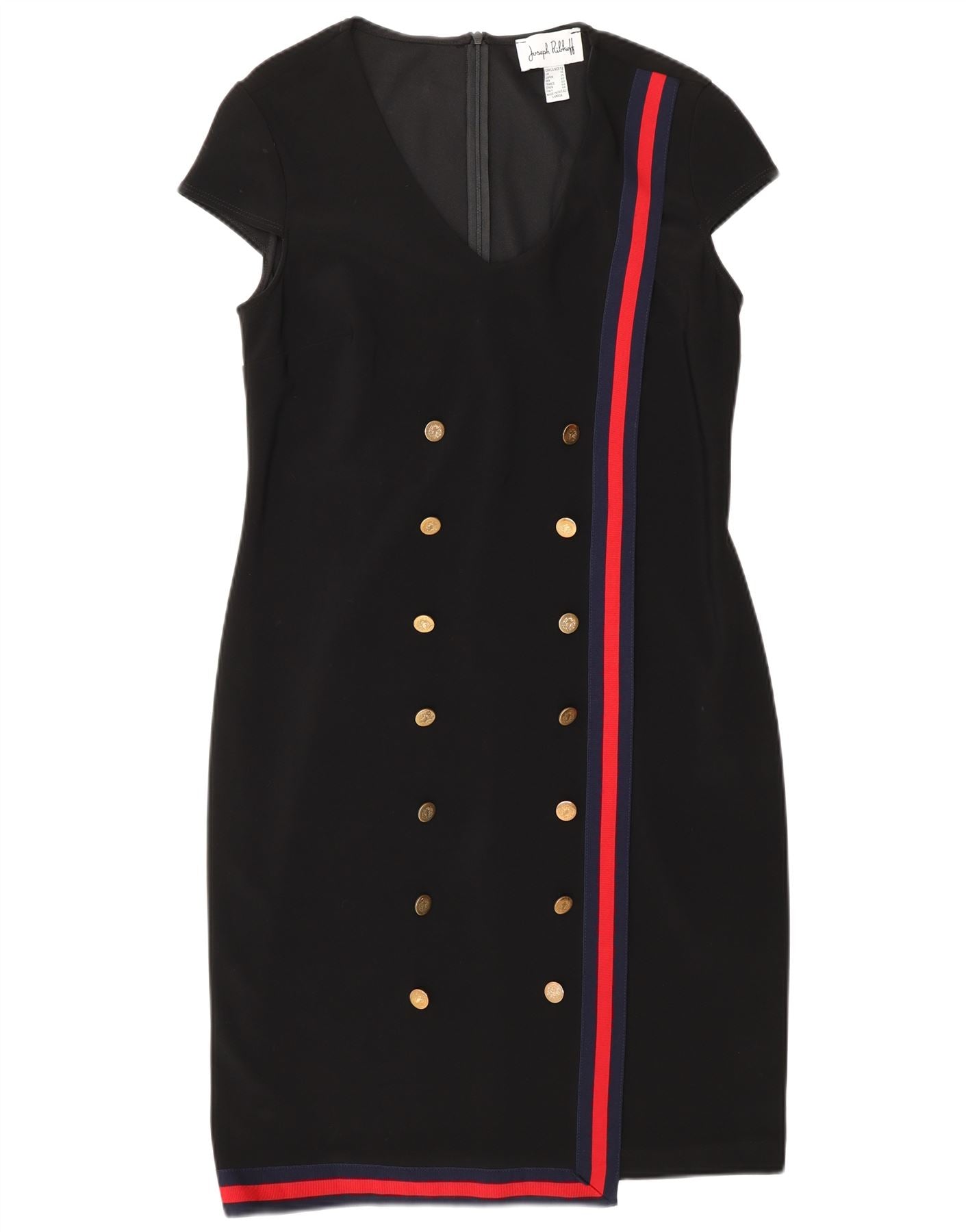 - AI Description: This Joseph Ribkoff women's sheath dress features a classic colourblock pattern in blended fabric. The V-neckline and short sleeves frame the bodice, while the slim fit accentuates the silhouette. A zip closure ensures a smooth line. Double-breasted button detailing adds a refined touch. Shoulder pads and lining provide structure. Made in Canada, this dress offers timeless style.