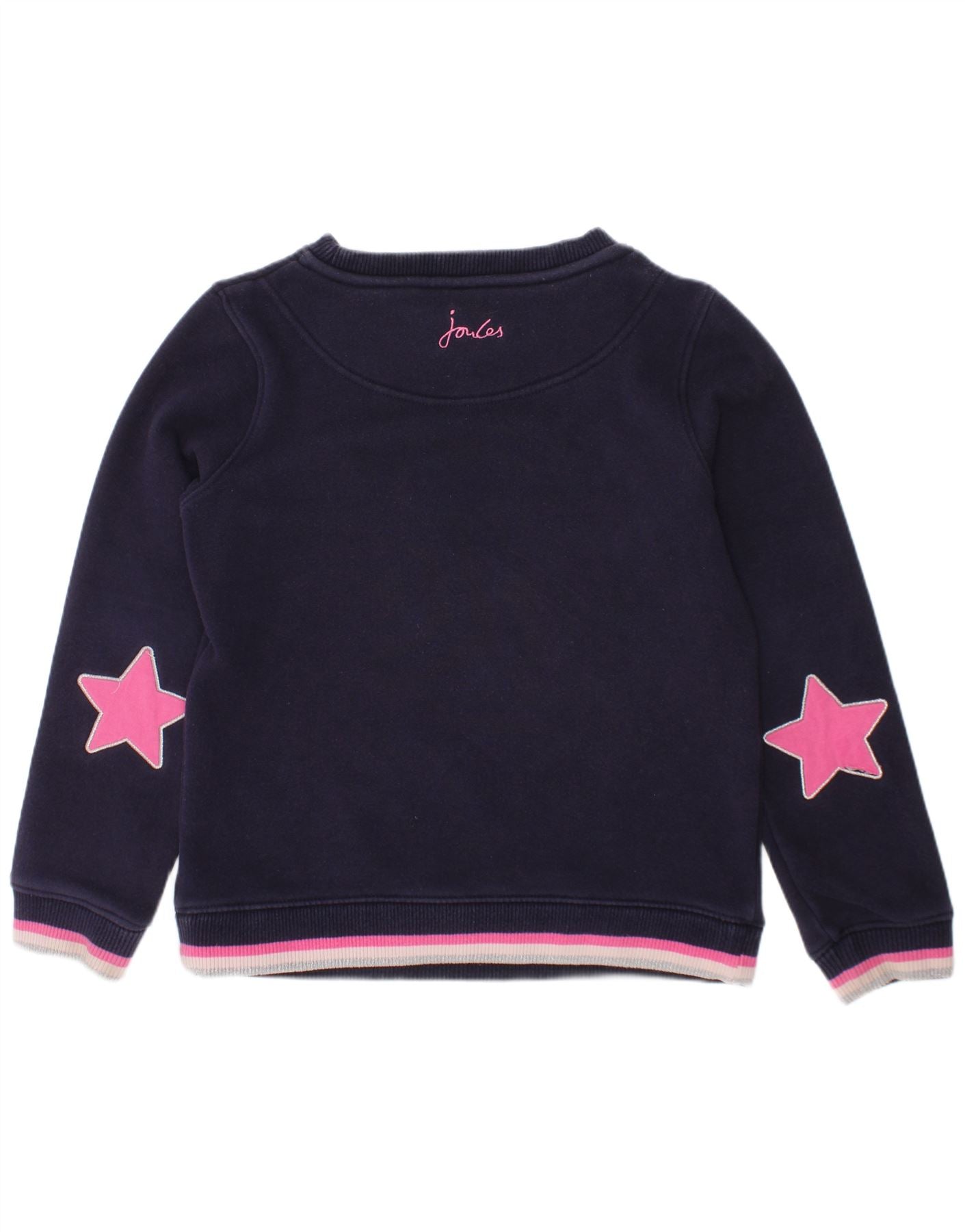 - Descripción de IA: Esta sudadera tipo jersey para niña de Joules está confeccionada con un suave punto azul marino 100 % algodón. Presenta un clásico cuello redondo y manga larga. El frente muestra un encantador gráfico de unicornio, detallado con lentejuelas brillantes. Apliques de estrellas rosas adornan las mangas, añadiendo un toque divertido. Los puños y el dobladillo a rayas proporcionan un acabado impecable. Este jersey ofrece un ajuste regular cómodo para el uso diario.