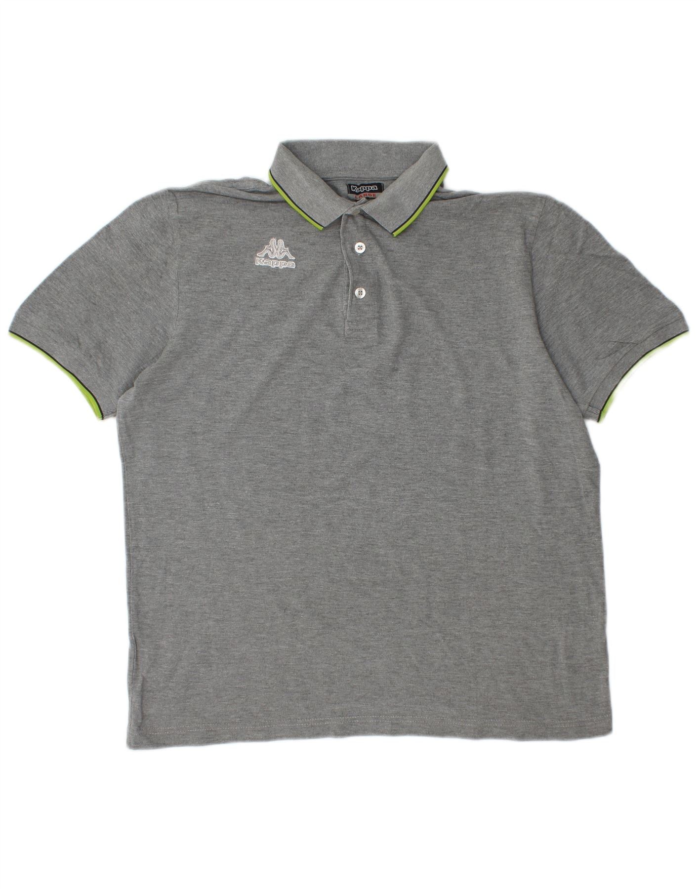 - Descripción de IA: Esta camiseta para hombre Kappa está confeccionada con suave jersey gris 100 % algodón. Presenta un escote de cuello clásico con tapeta de dos botones. Las mangas cortas están rematadas con un ribete verde lima en contraste, a juego con el detalle interior del cuello. Un logotipo de Kappa bordado se encuentra en el pecho. El corte regular garantiza comodidad y un estilo deportivo atemporal.