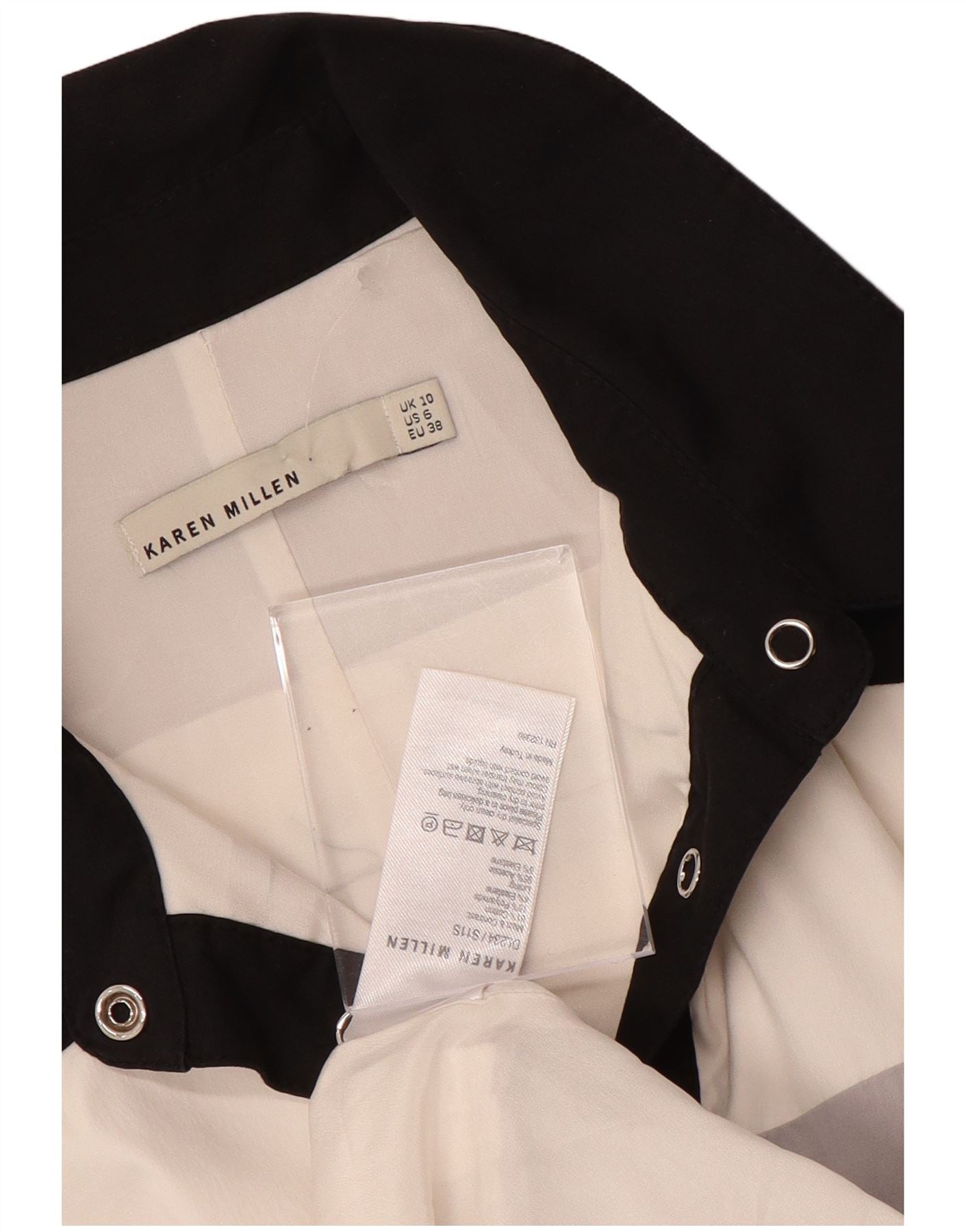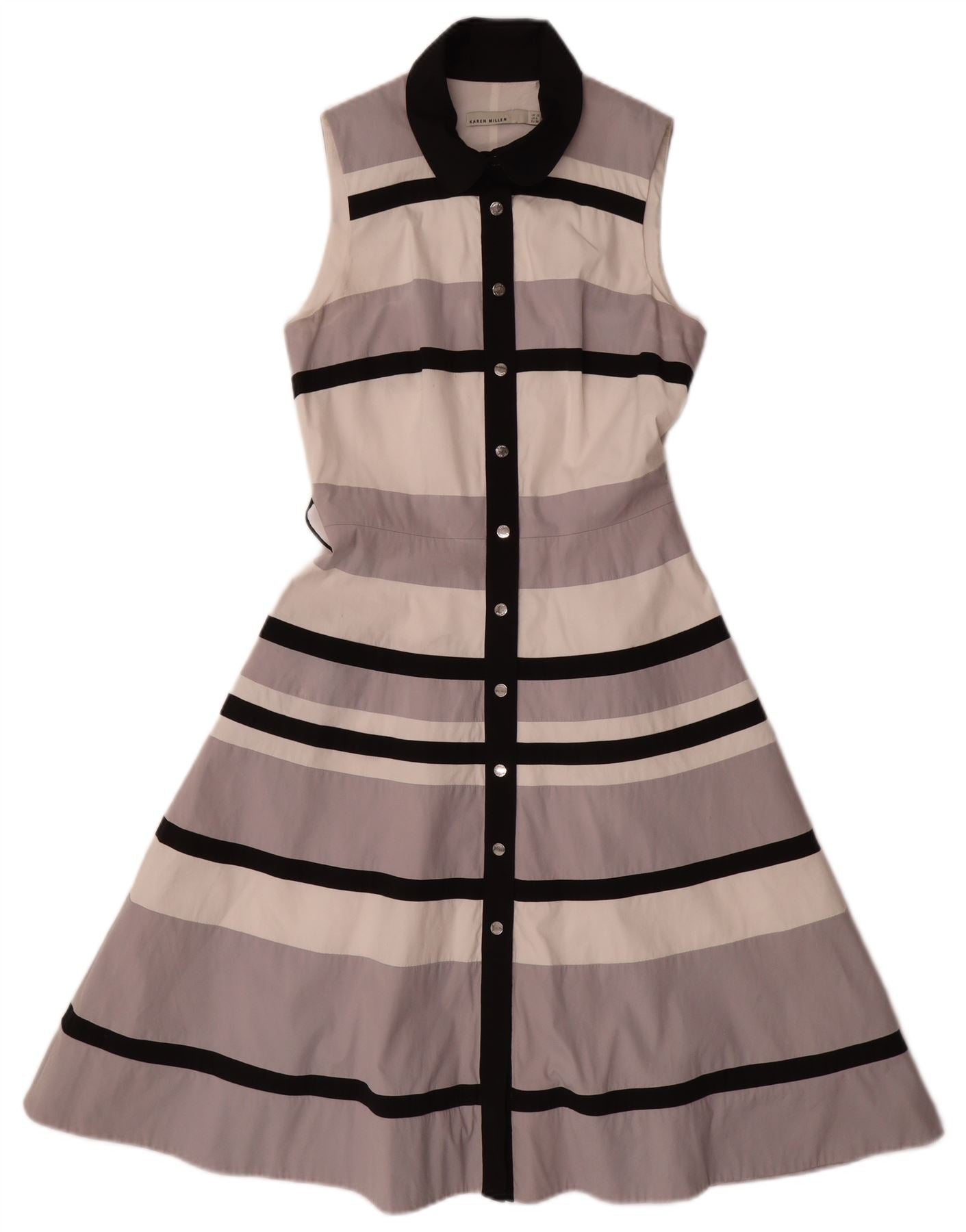 - AI Description: This Karen Millen womens shirt dress is crafted from a woven cotton blend with a hint of elastane. It features a sophisticated multicoloured striped pattern. The collared neckline and button-up front offer a classic silhouette. Its sleeveless design is perfect for warmer days. An empire waist flatters the figure. Practical pockets add functionality. The regular fit ensures comfortable wear for a timeless style.