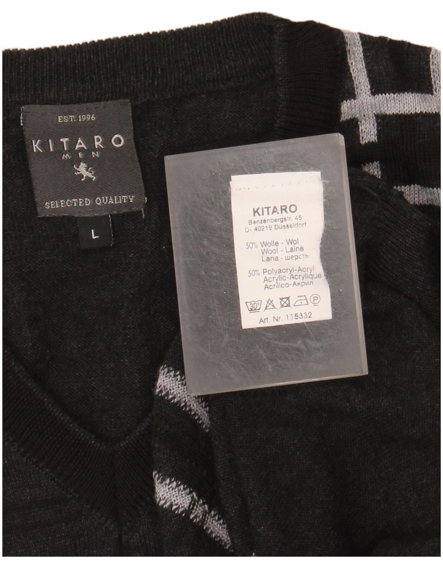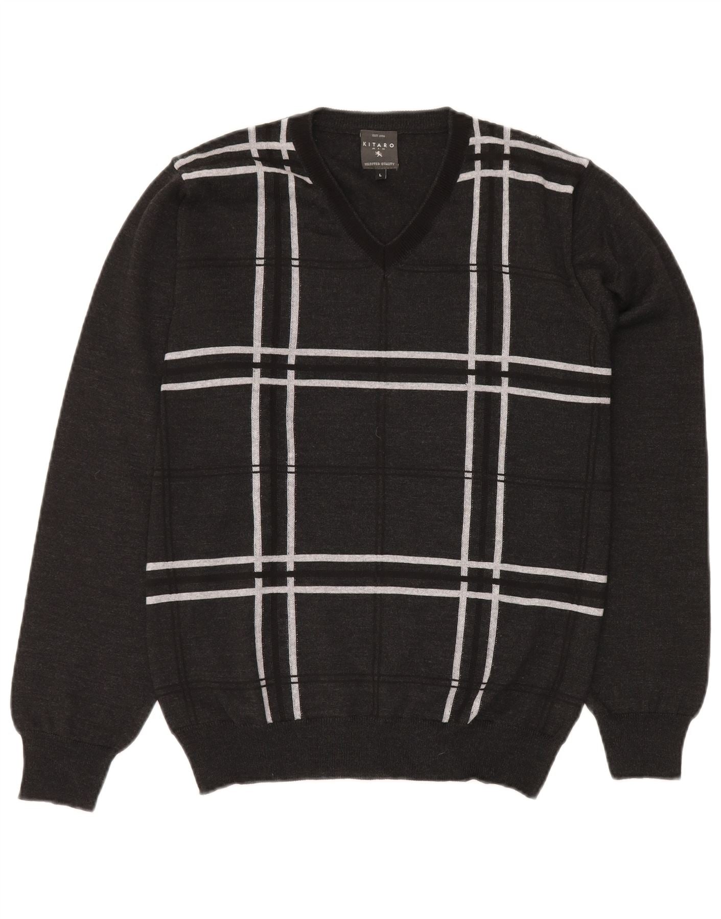 KITARO Jersey con cuello en V para hombre de lana a cuadros gris grande