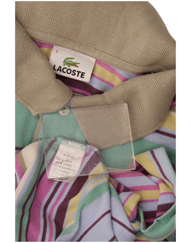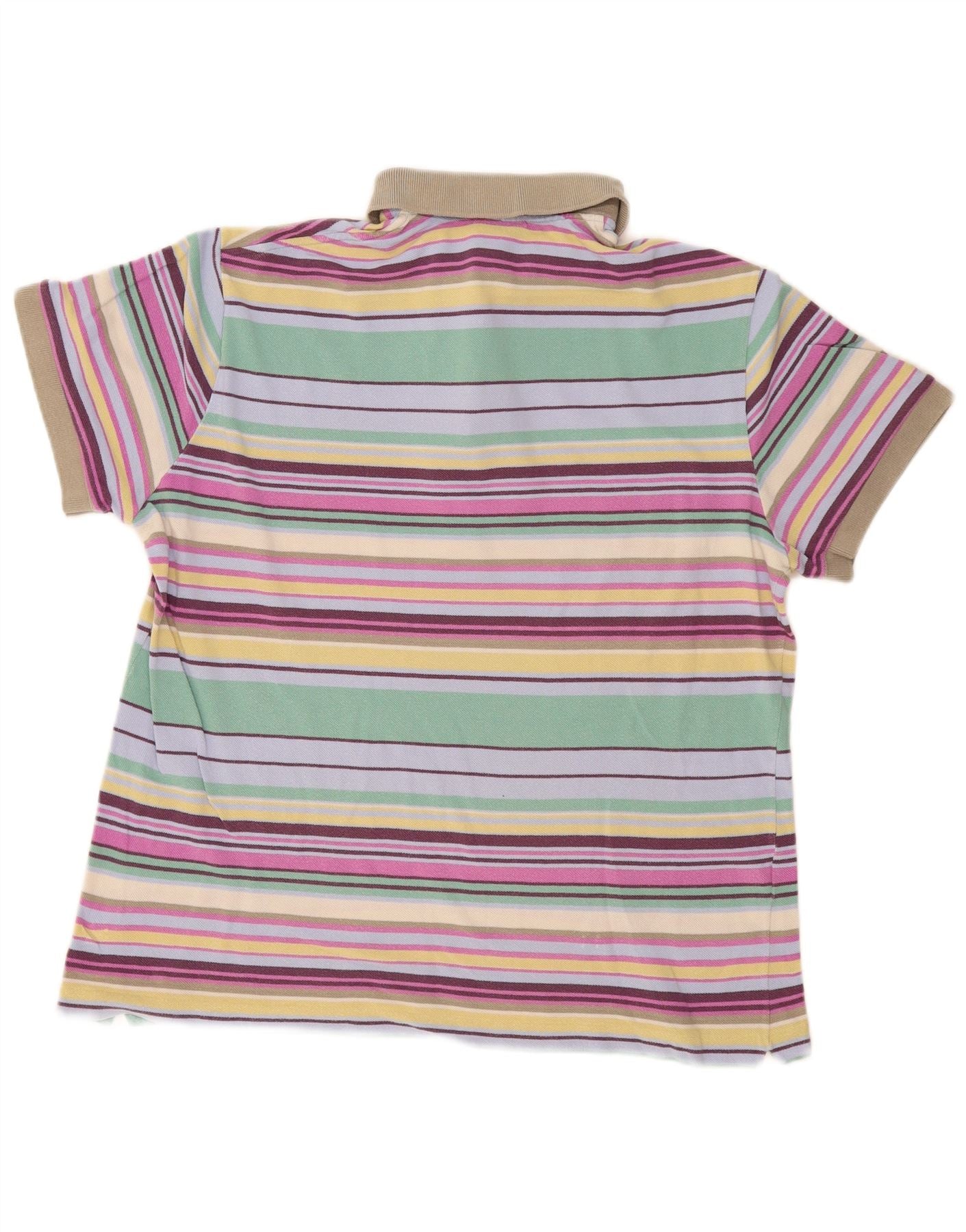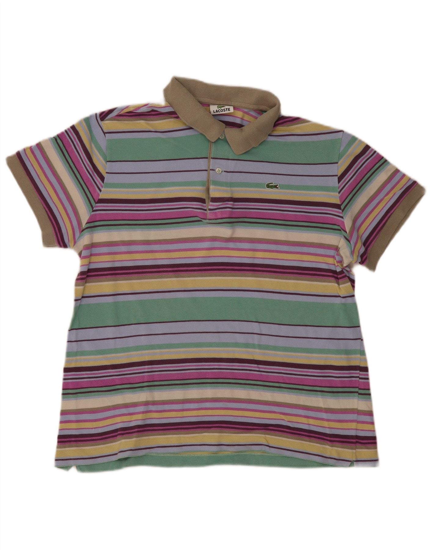 - AI Description: This Lacoste mens Polo Shirt is crafted from 100 percent cotton knit, offering a breathable and comfortable feel with stretch. It features a vibrant multicoloured striped pattern, blending green, purple, and pink hues. The collared neckline and button closure provide a classic structure. Short sleeves and a regular fit ensure effortless wear. An embroidered logo adds a signature accent.