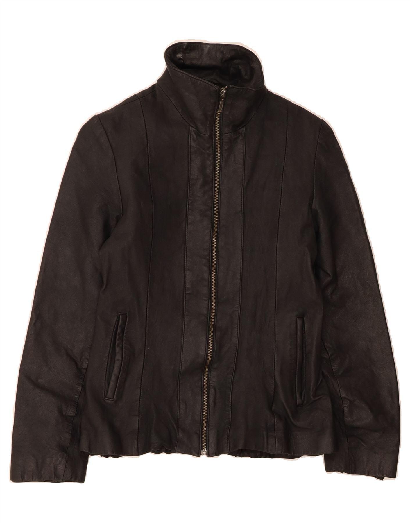 - AI Description: This LLD women's leather jacket is a classic biker style in pre-owned excellent condition, showing minor visible wear throughout. Crafted from 100% real leather with a polyester lining, it features a full zip closure, long sleeves, and a collared neckline. The regular fit jacket includes practical zipped pockets and a zip accent. Labelled size 12.