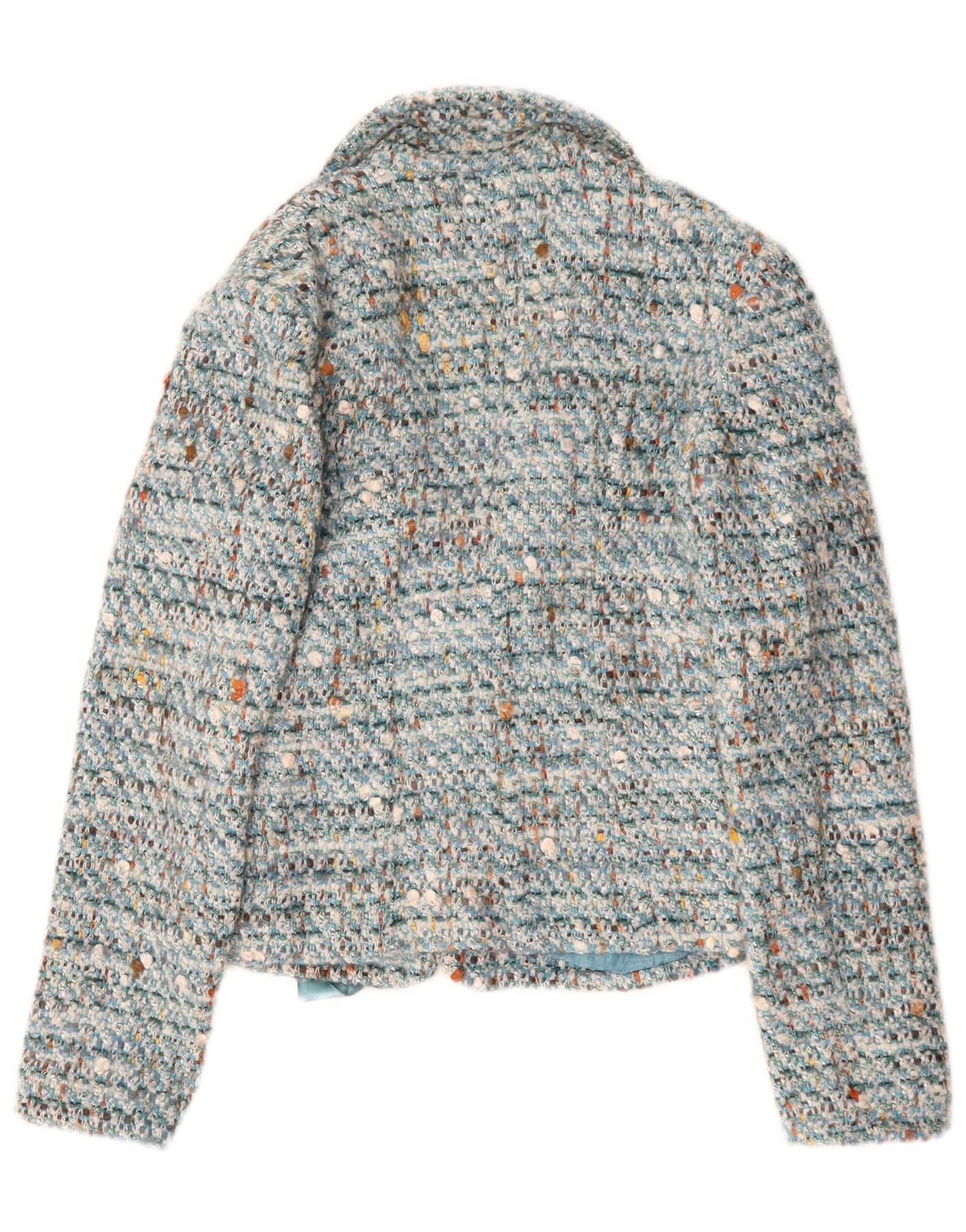 - Descripción de IA: Esta chaqueta para mujer Luisa Spagnoli está confeccionada con un lujoso tweed de lana turquesa. Presenta un patrón moteado con sutiles detalles multicolores. El escote con cuello y las mangas largas ofrecen una estructura clásica. Un delicado cierre de lazo con detalle de lazo ciñe la cintura. Esta chaqueta de corte regular está completamente forrada, brindando comodidad y un acabado refinado.