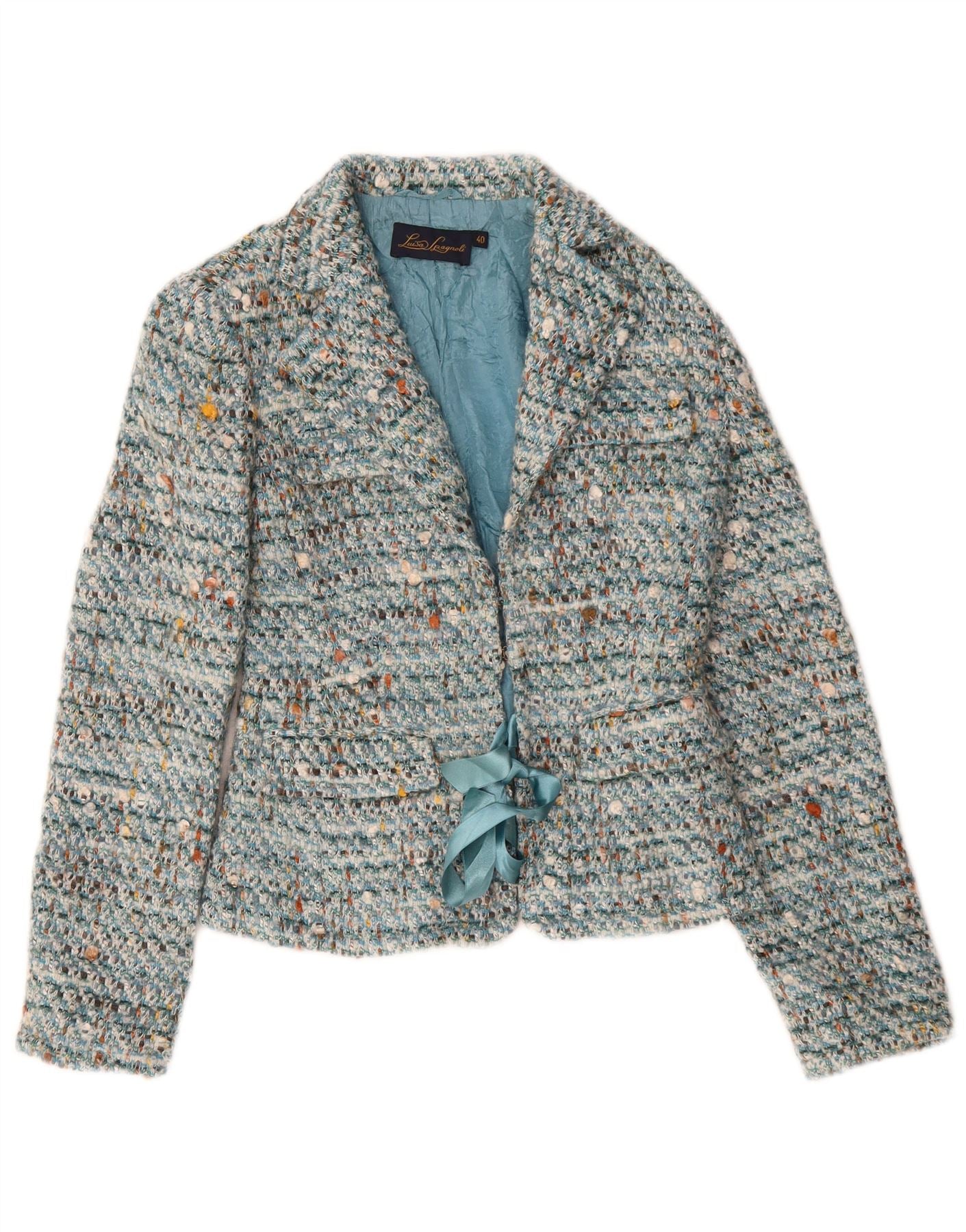 Luisa Spagnoli Chaqueta tipo blazer con lazo frontal para mujer IT 40 Small Blue Moteado