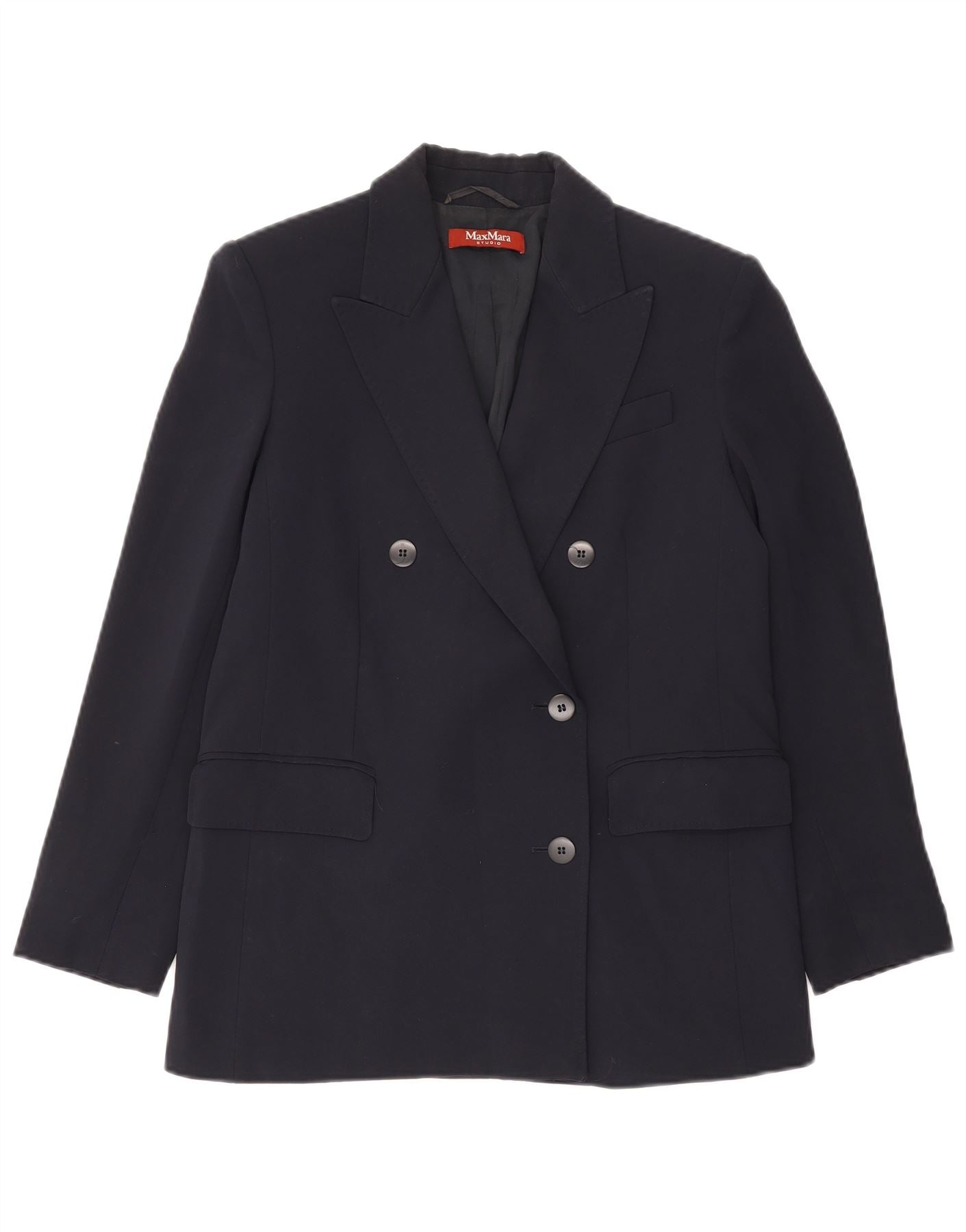 - AI Description: This Max Mara womens navy blue double breasted blazer jacket is expertly crafted from a luxurious triacetate blend. The woven fabric provides a smooth, refined texture. It features a classic collared neckline and a sophisticated double breasted button closure. Long sleeves and a regular fit ensure a comfortable and elegant silhouette. Functional pockets complete this timeless design.