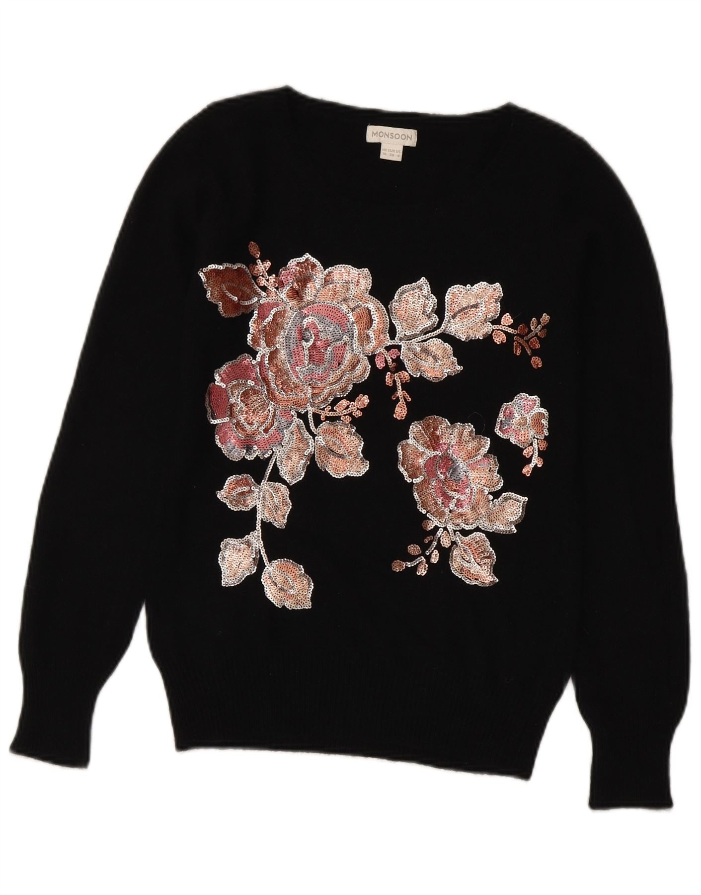MONSOON Womens Boat Neck Jumper Sweater UK 10 Small Black Floral Polyamide