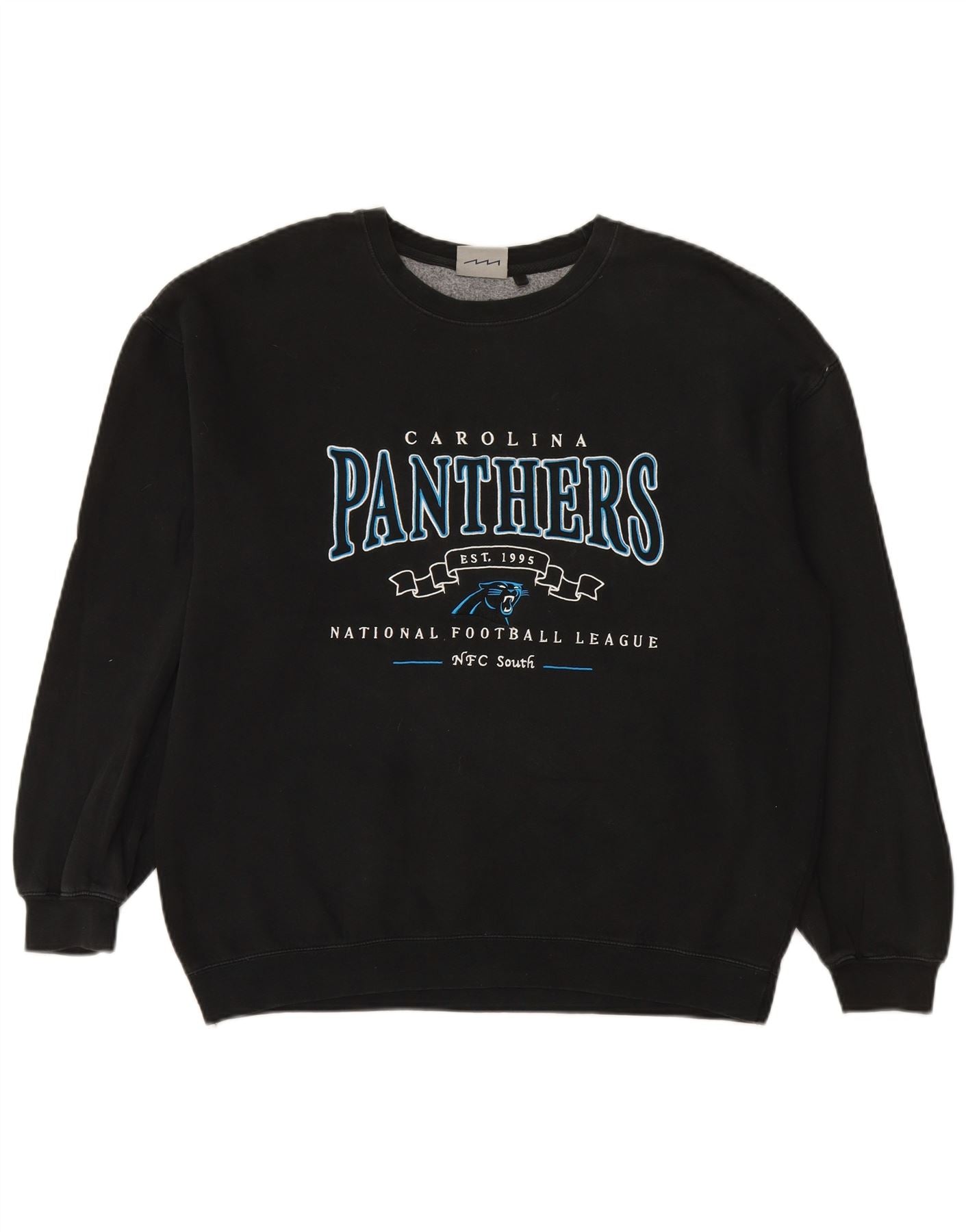 - AI Description: This NFL mens sweatshirt jumper is crafted from soft black fleece fabric. It offers comfort, stretch, and a lined interior. The pullover design features a classic round neck and long sleeves. It has a regular fit for easy wear. A prominent Carolina Panthers logo provides a bold accent. This sports style jumper is ideal for fans of American Football.