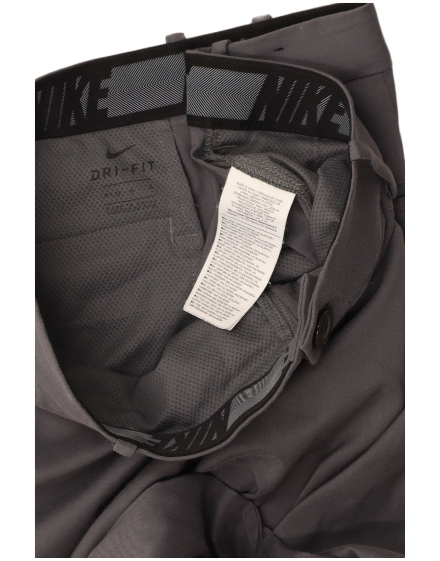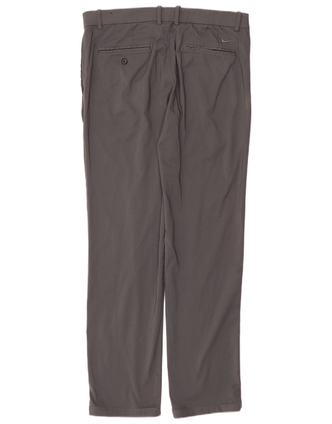 - AI Description: This Nike mens Casual Trousers are crafted from a grey woven polyester blend, offering both stretch and breathability. They feature a straight leg and a regular fit, designed for athletic movement. A button closure ensures a secure fit. Practical pockets add functionality. The design is finished with a subtle Nike logo accent, embodying a sports style perfect for golf.