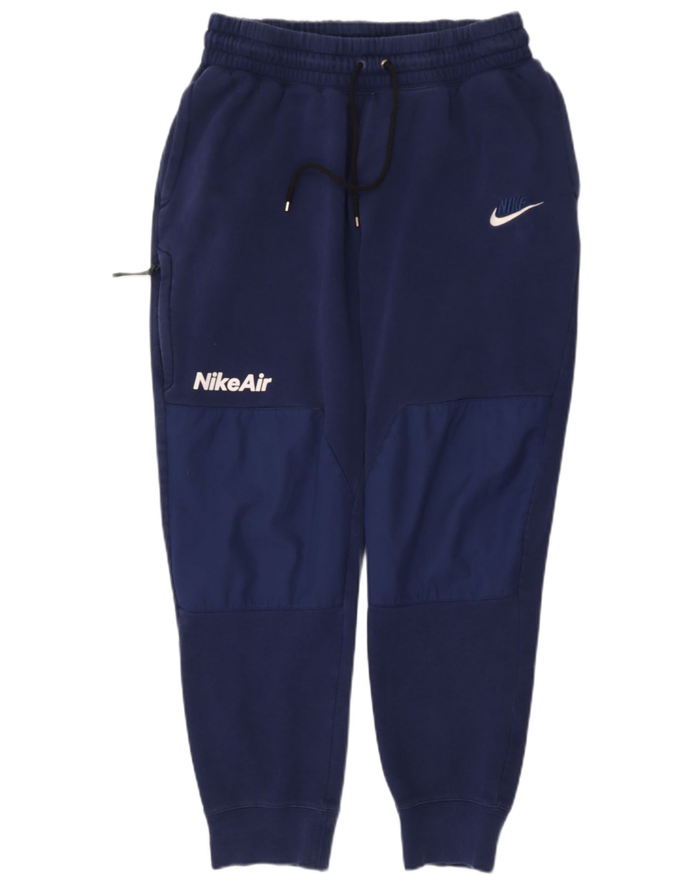 - AI Description: This Nike mens tracksuit trousers joggers are crafted from soft navy blue polyester knit fabric, featuring a comfortable fleece interior. They offer a regular fit with a pull-on elastic waist for ease. The cuffed ankles provide a neat finish. Practical pockets are included, and a subtle Nike Air logo adds a signature sports accent.