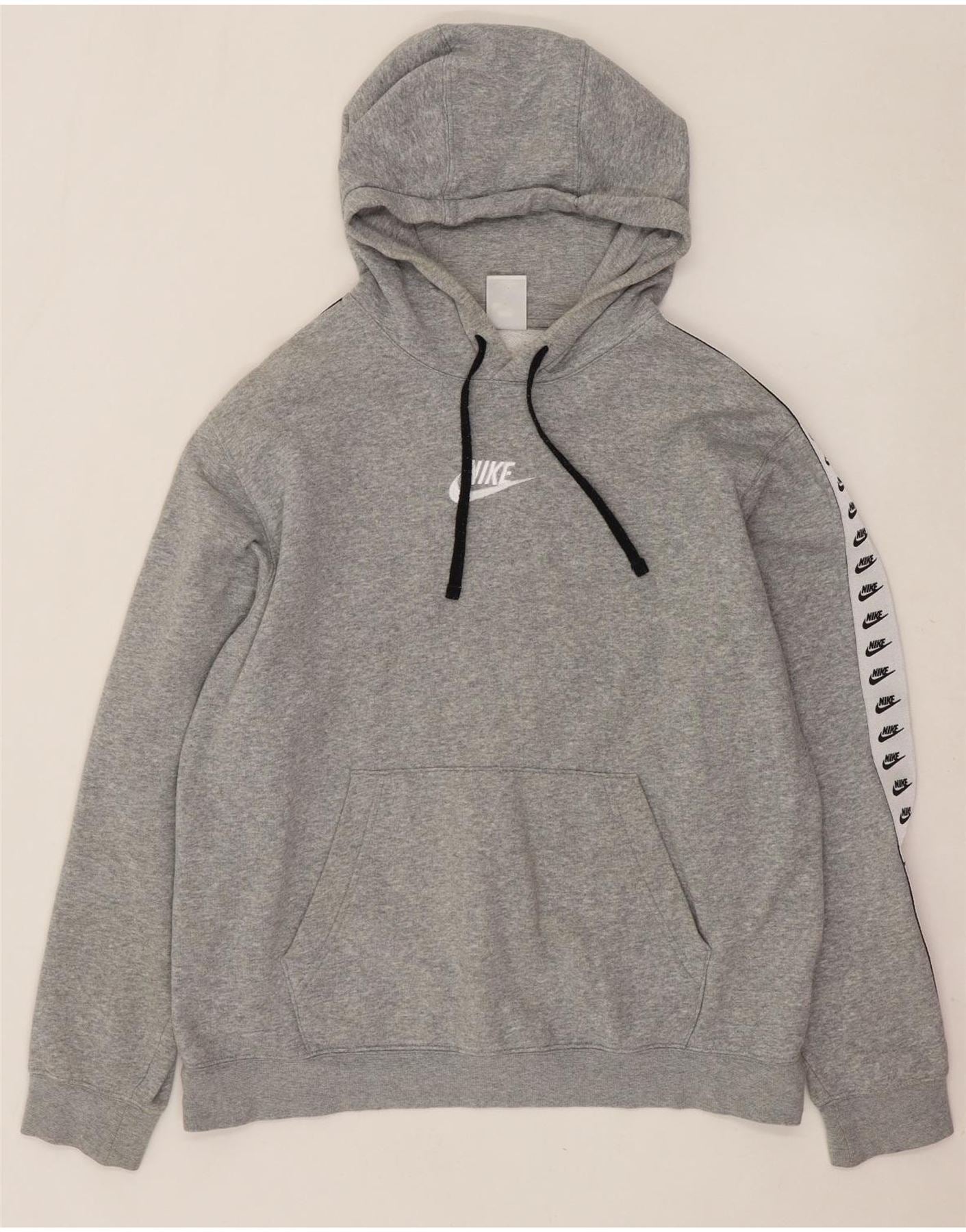 - Descripción de IA: Esta sudadera con capucha Nike para hombre está confeccionada con una suave mezcla de algodón y poliéster de color gris. Presenta un diseño de jersey clásico con un cómodo ajuste regular. El escote con capucha incluye cordones ajustables para una sensación personalizada. Las mangas largas están detalladas con una cinta con el logo repetido, añadiendo un toque distintivo. Un práctico bolsillo canguro en la parte delantera realza su atractivo informal.