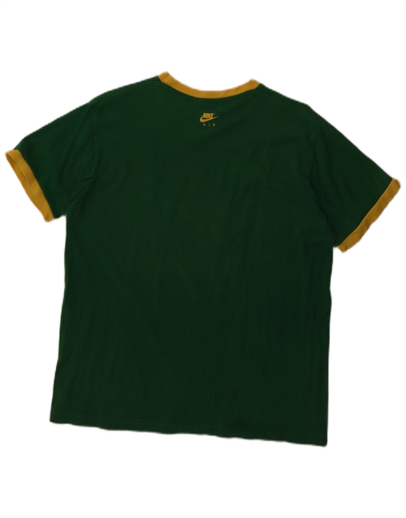 - AI Description: This Nike mens Graphic T-Shirt Top is crafted from soft green jersey fabric. It features a classic round neck and short sleeves. The regular fit ensures comfortable wear. A prominent Nike Air logo accentuates the design. This sports style pullover offers effortless athletic appeal. It is perfect for everyday casual or active use.