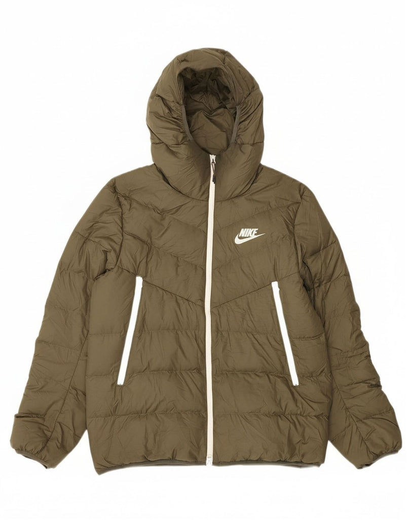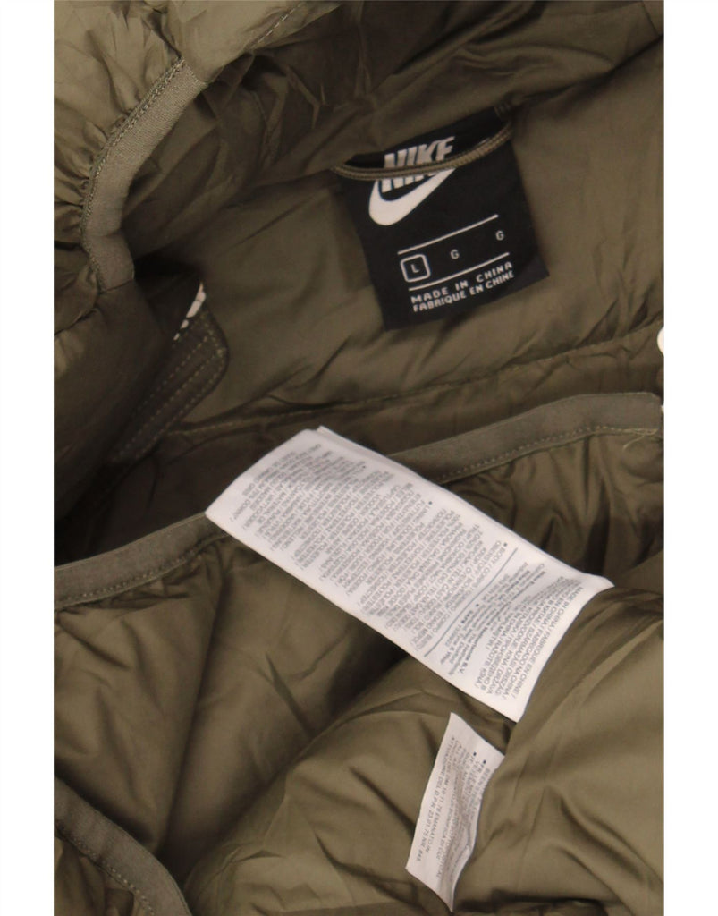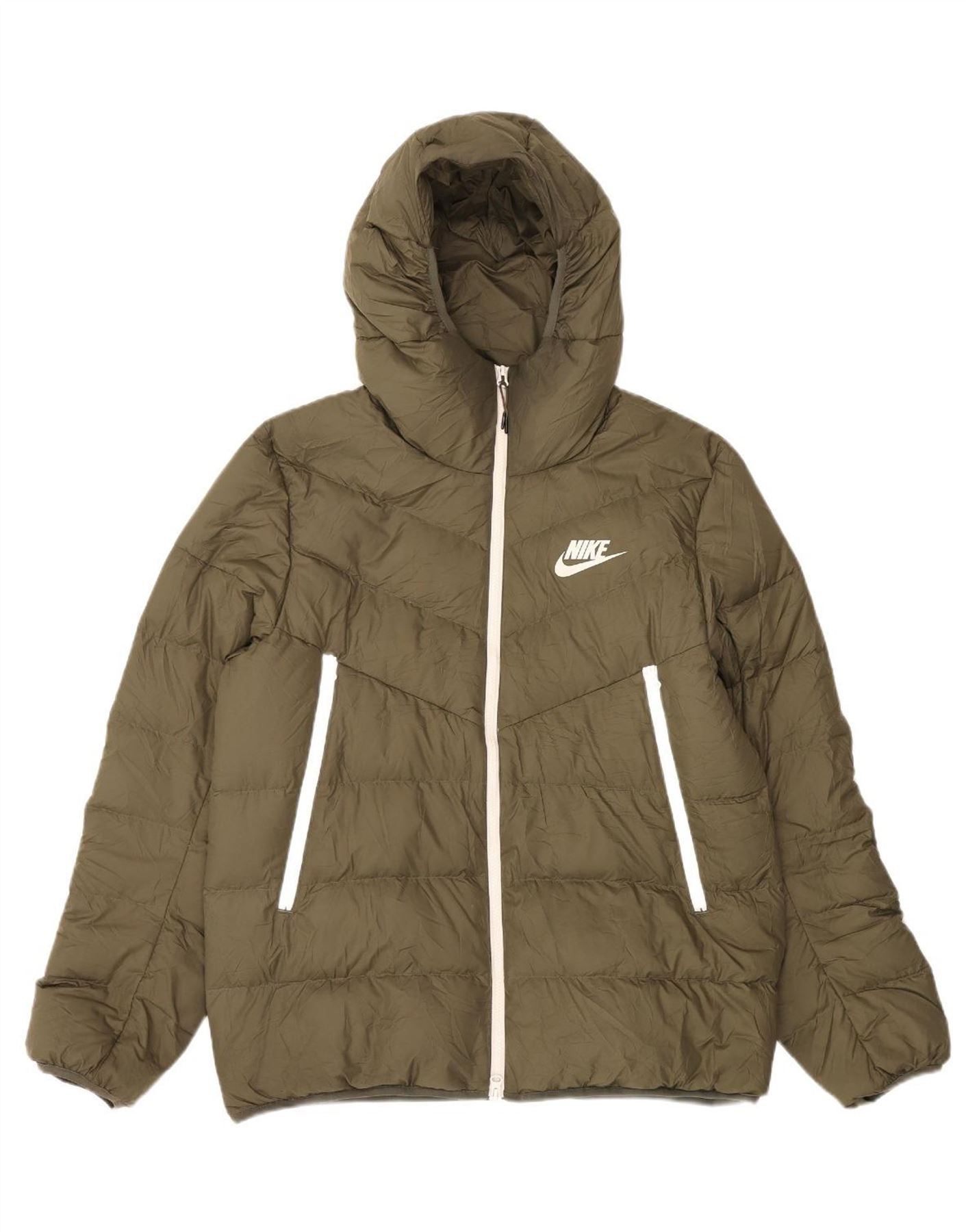 - AI Description: This Nike men's padded jacket comes in a versatile khaki polyester, providing excellent thermal warmth. The woven fabric offers a smooth, quilted texture for superior insulation. It features a full zip closure extending to a functional hooded design. Long sleeves and zipped pockets enhance practicality. A regular fit ensures comfortable wear, subtly finished with a brand logo.