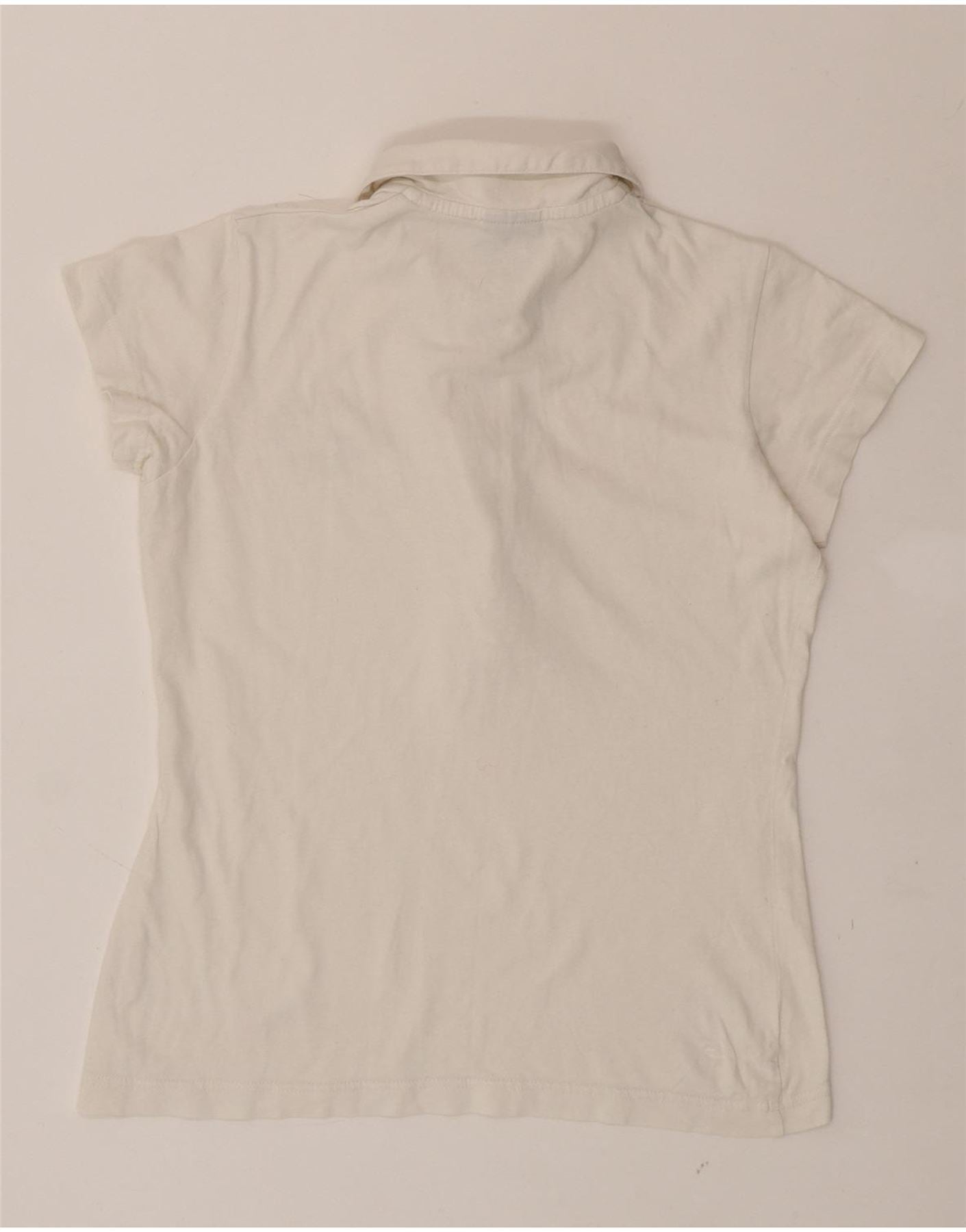 - AI Description: This pre-owned Nike T-shirt top for women features a collared neckline and short sleeves, perfect for sports or casual wear. The off-white knit fabric offers a comfortable, regular fit, accentuated by a logo detail. It has a button closure. The item is in good condition with minor stains on the front. Label size is L, made in Malaysia.