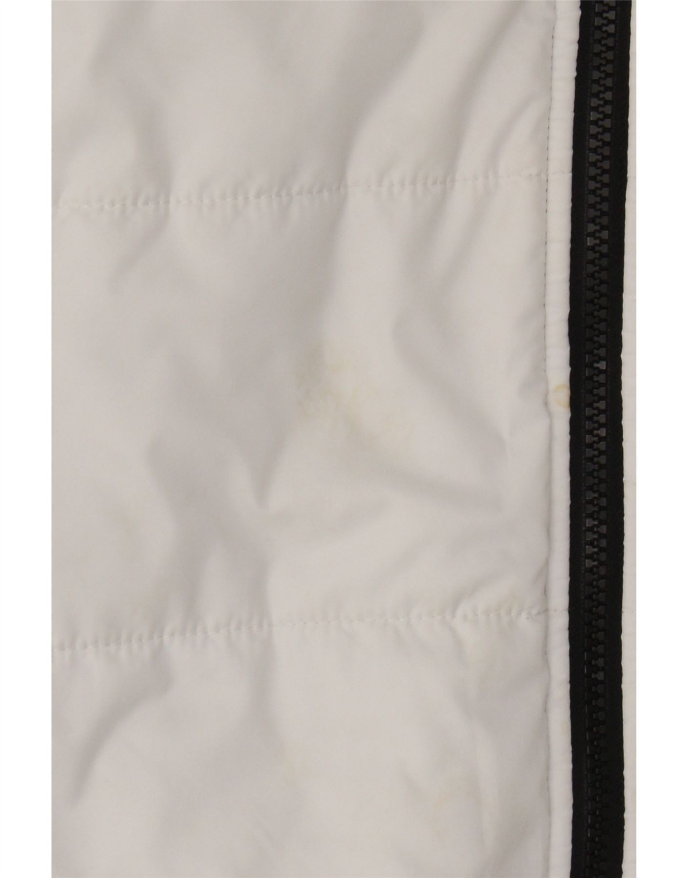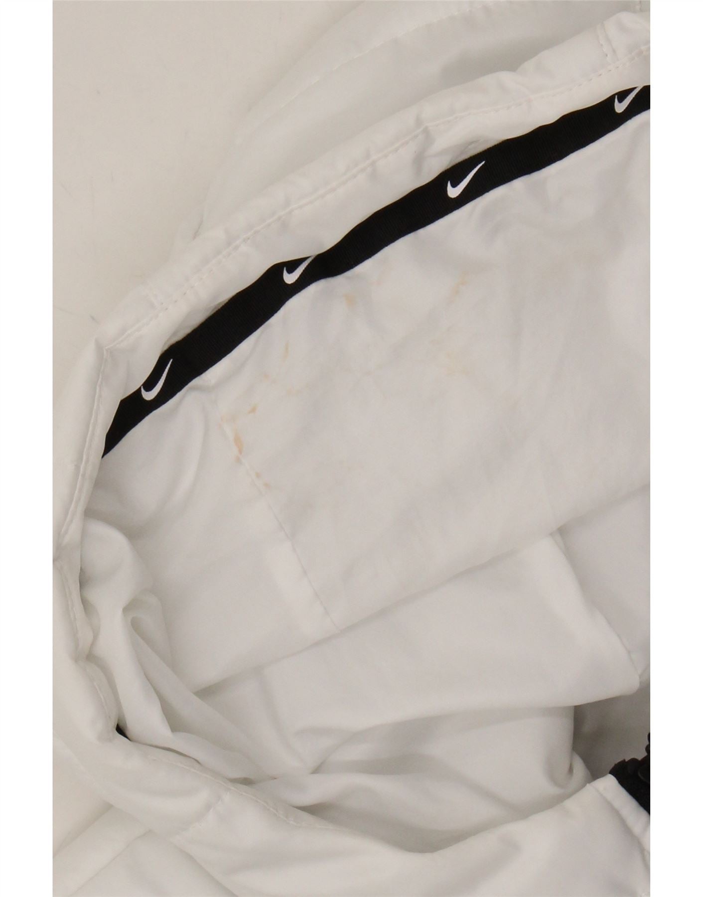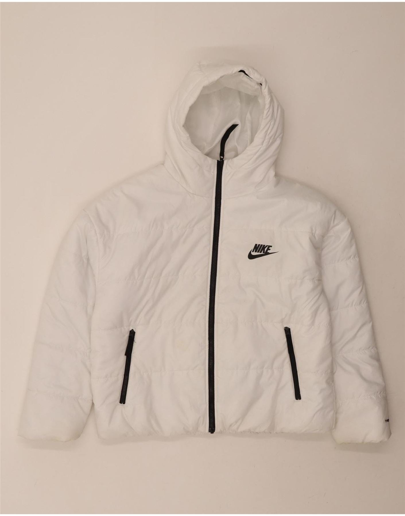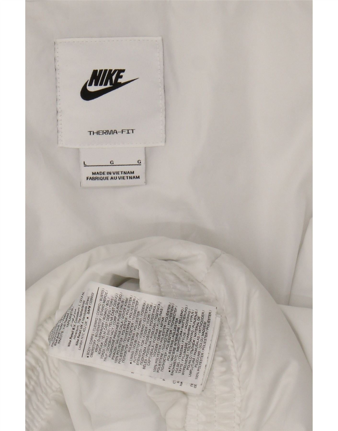 - AI Description: This pre-owned Nike padded jacket is perfect for sports or casual wear. Crafted from 100% polyester, it features a regular fit, full zip closure, hood, and pockets. The white jacket has a logo accent and a quilted design. Please note: it has moderate stains on the front and sleeves, and minor stains on the inside lining. Label size G, made in Vietnam.