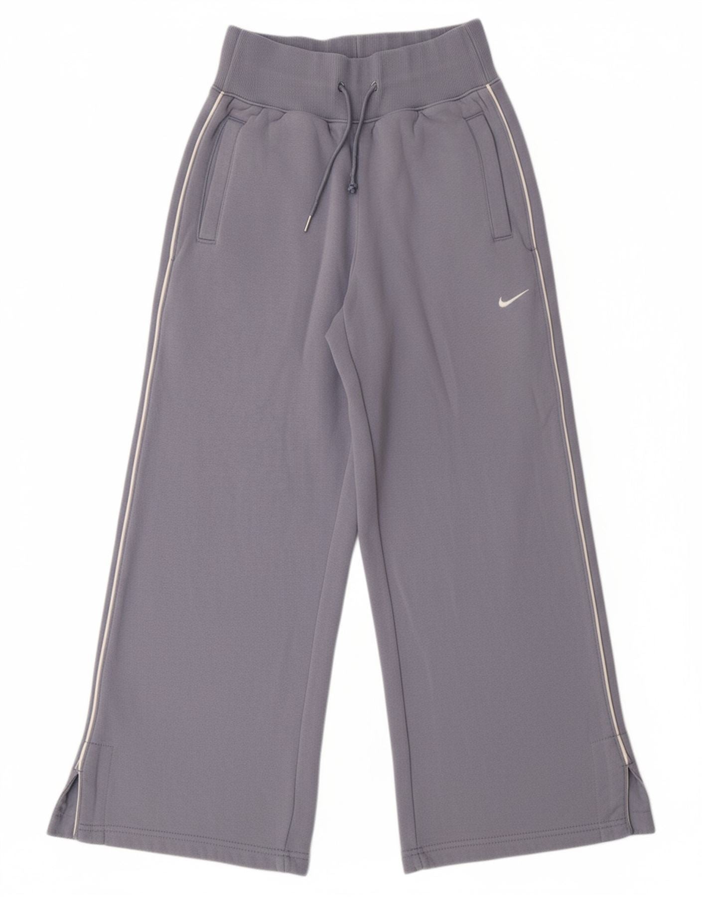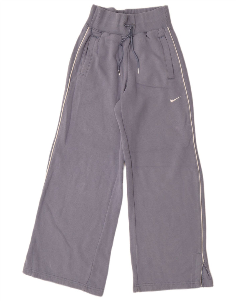 - AI Description: This Nike women's tracksuit trousers joggers are crafted from a soft blue blended fabric, featuring a cosy fleece interior. The 80 percent cotton, 20 percent polyester blend ensures comfort. They offer a relaxed, wide-leg fit for unrestricted movement. An elasticated drawstring waist provides an adjustable, secure feel. Practical pockets are included. A subtle Nike logo accent adds a signature sports touch. These sports trousers are ideal for comfort and style.