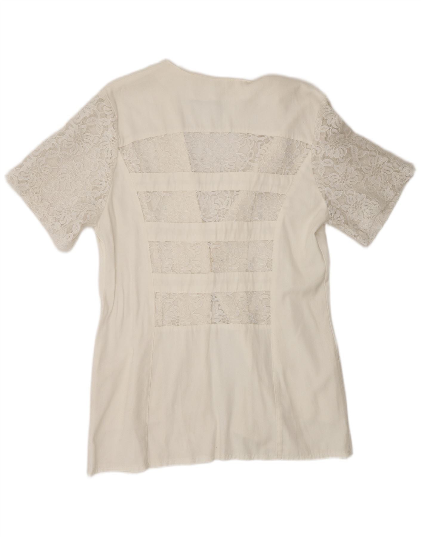 - Descripción de IA: Esta blusa para mujer de Paola está confeccionada con un tejido blanco y presenta delicados detalles de encaje. Tiene un escote en pico clásico y manga corta. El corte regular garantiza una gran comodidad. Los paneles de encaje adornan las mangas y la espalda, añadiendo un elemento sofisticado y transparente. Un cierre de un solo botón asegura la parte delantera. También hay bolsillos sutiles. Este estilo clásico ofrece una elegante versatilidad.