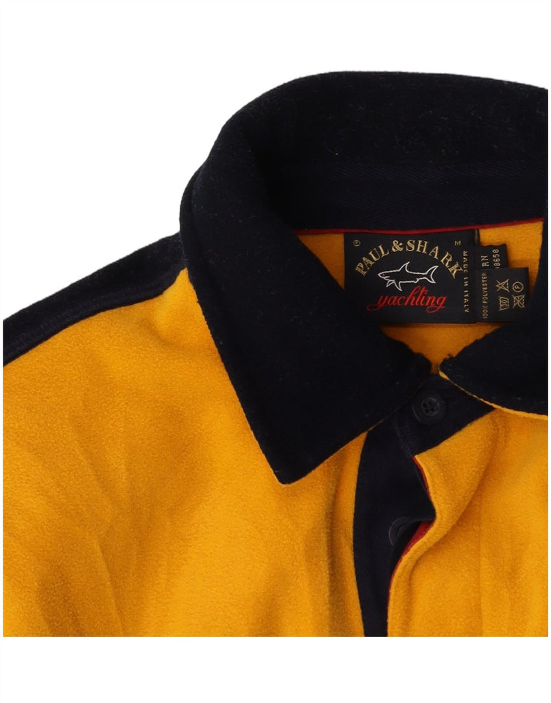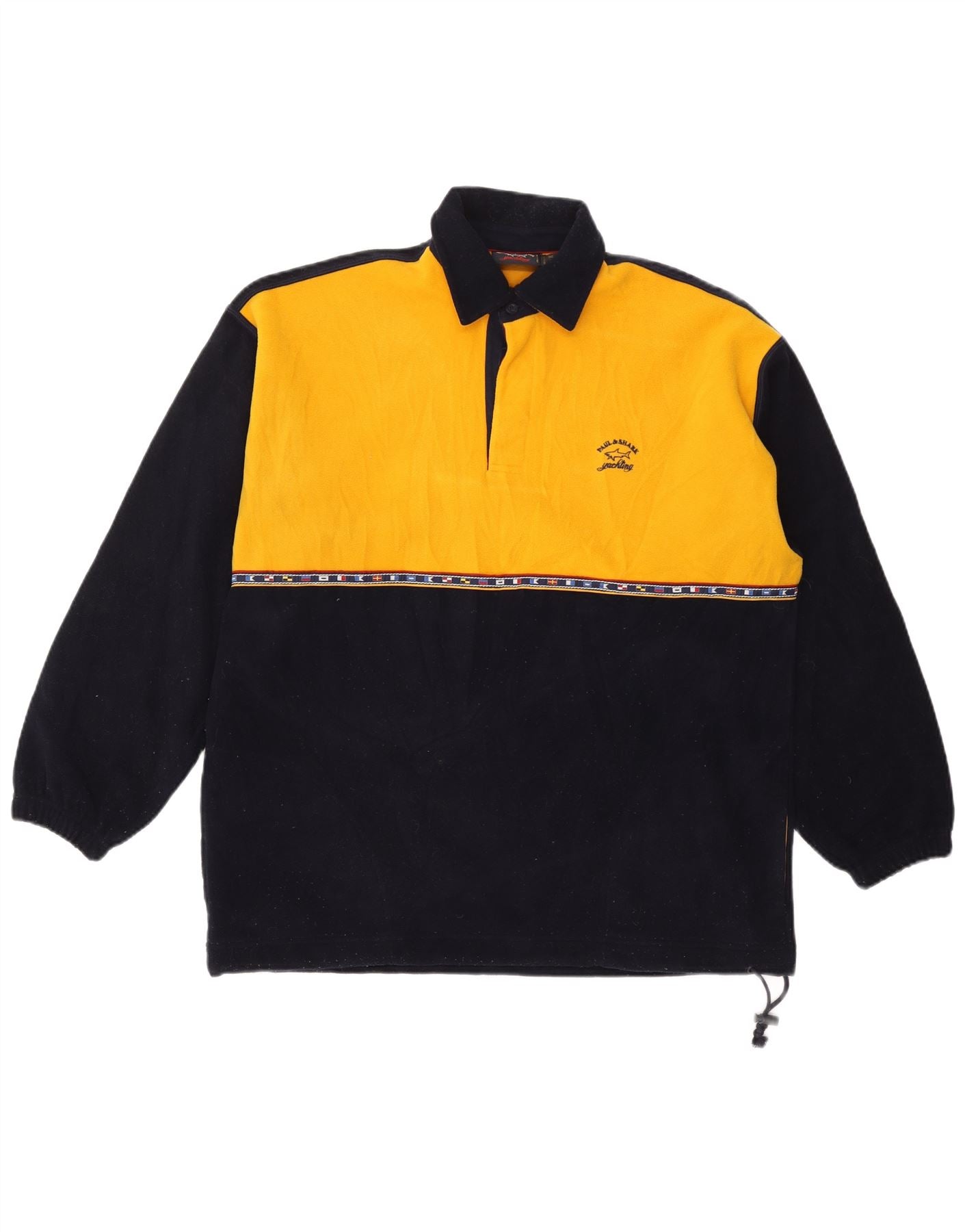 - AI Description: This Paul & Shark mens sweatshirt jumper is crafted from soft 100 percent polyester fleece. It features a striking multicoloured colourblock pattern in yellow, blue, and black. The collared neckline and button-up Henley style offer a smart, adjustable fit. Long sleeves and a regular fit ensure comfort and ease of movement. A subtle logo accent completes the nautical-inspired design. This lightweight garment provides excellent comfort.