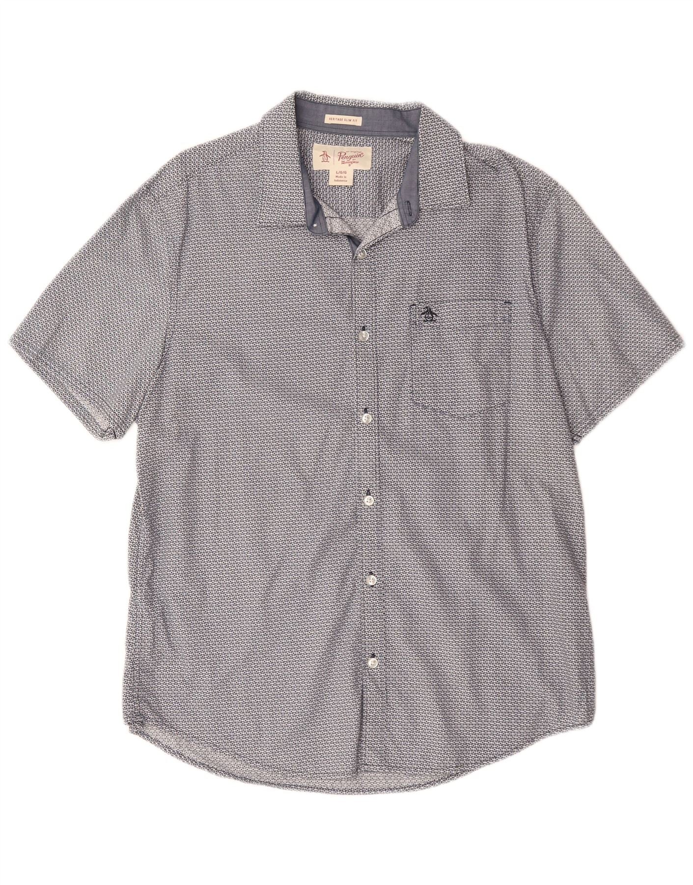 PENGUIN Camisa de manga corta Heritage Slim Fit para hombre, talla grande, azul geométrico