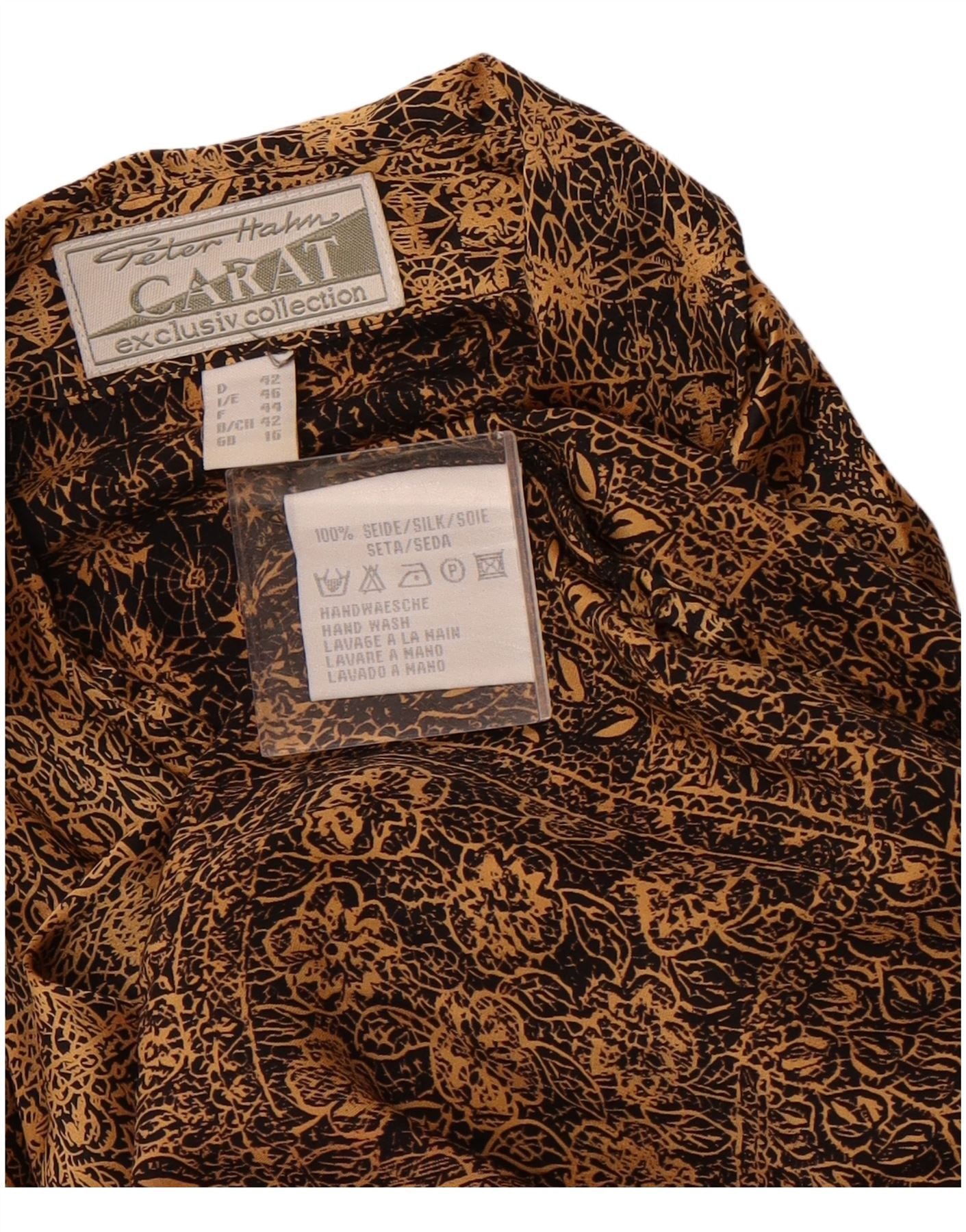 - AI Description: This Peter Hahn womens Blouse Top is crafted from luxurious 100 percent silk satin. It features a sophisticated brown, black, and yellow floral abstract pattern. The collared neckline and long sleeves offer a classic silhouette. A button-up front ensures a refined finish. Its regular fit provides comfortable elegance for any occasion.