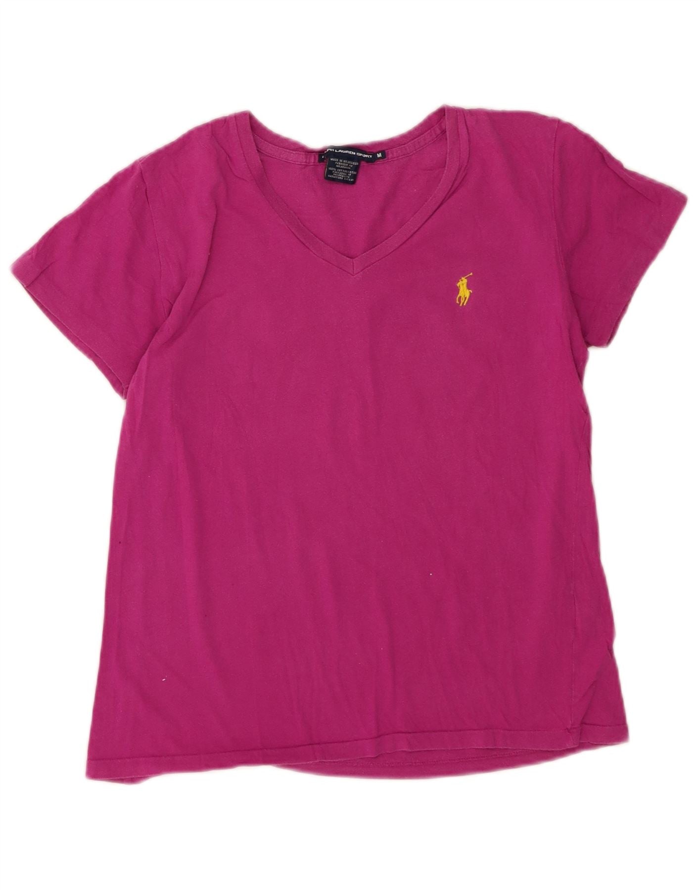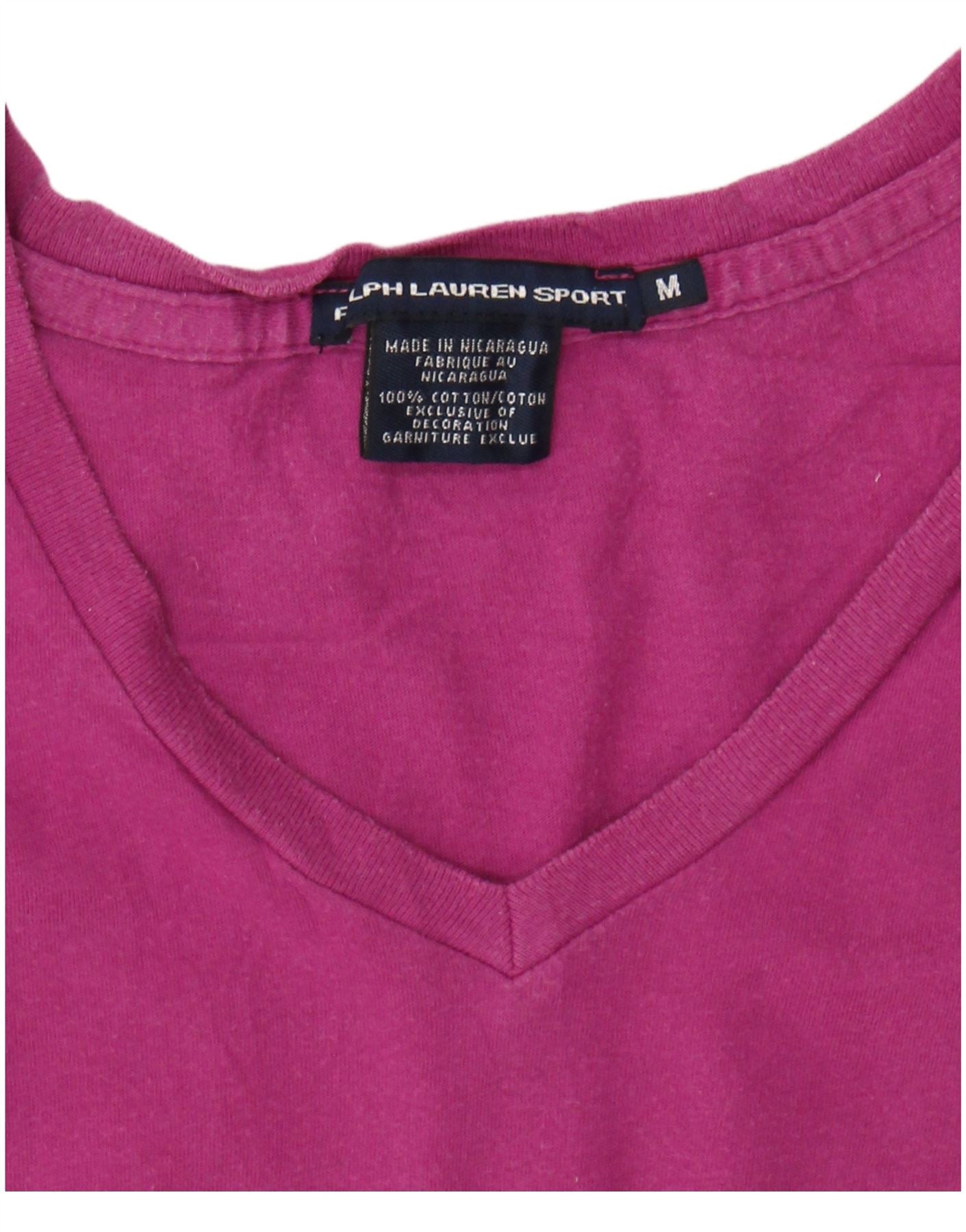 - AI Description: This Ralph Lauren Polo Sport womens T-shirt top is crafted from soft pink 100 percent cotton knit. It features a flattering V-neckline and comfortable short sleeves. The regular fit ensures a relaxed silhouette. A subtle brand logo provides a signature accent. This versatile piece offers effortless style and comfort for everyday wear.