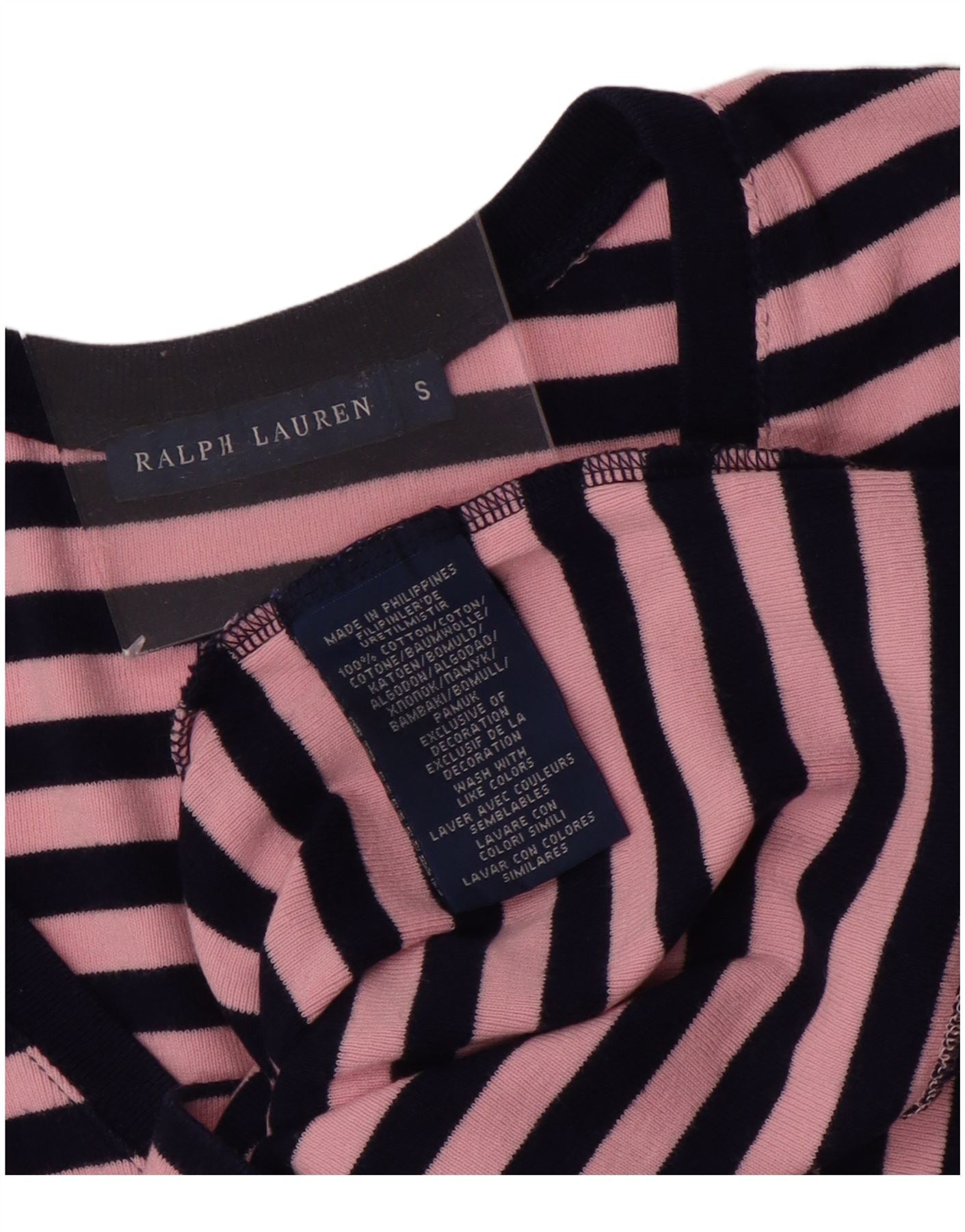 - AI Description: This Ralph Lauren womens T-shirt top is crafted from soft 100 percent cotton jersey. It features a vibrant multicoloured striped pattern. The V-neckline offers a flattering shape, complemented by classic short sleeves. Designed for a regular fit, this pullover style ensures comfortable wear. A subtle logo detail adds a signature touch, embodying classic style.