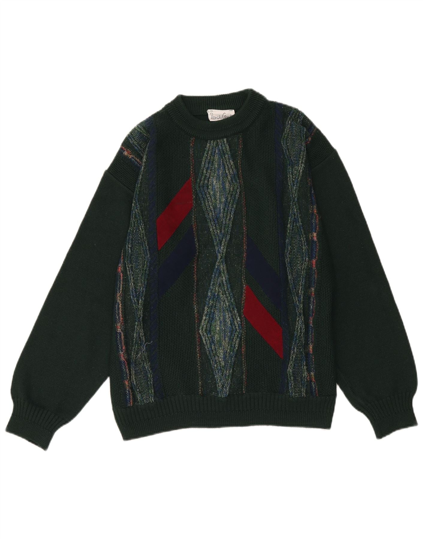 - AI Description: This Renato Cavalli mens Crew Neck Jumper Sweater is presented in a rich green knit fabric. It features a distinctive geometric pattern throughout. The classic round neck and long sleeves offer a timeless silhouette. Designed for a regular fit, it ensures comfortable wear. This pullover style is both practical and stylish, perfect for a refined casual look.