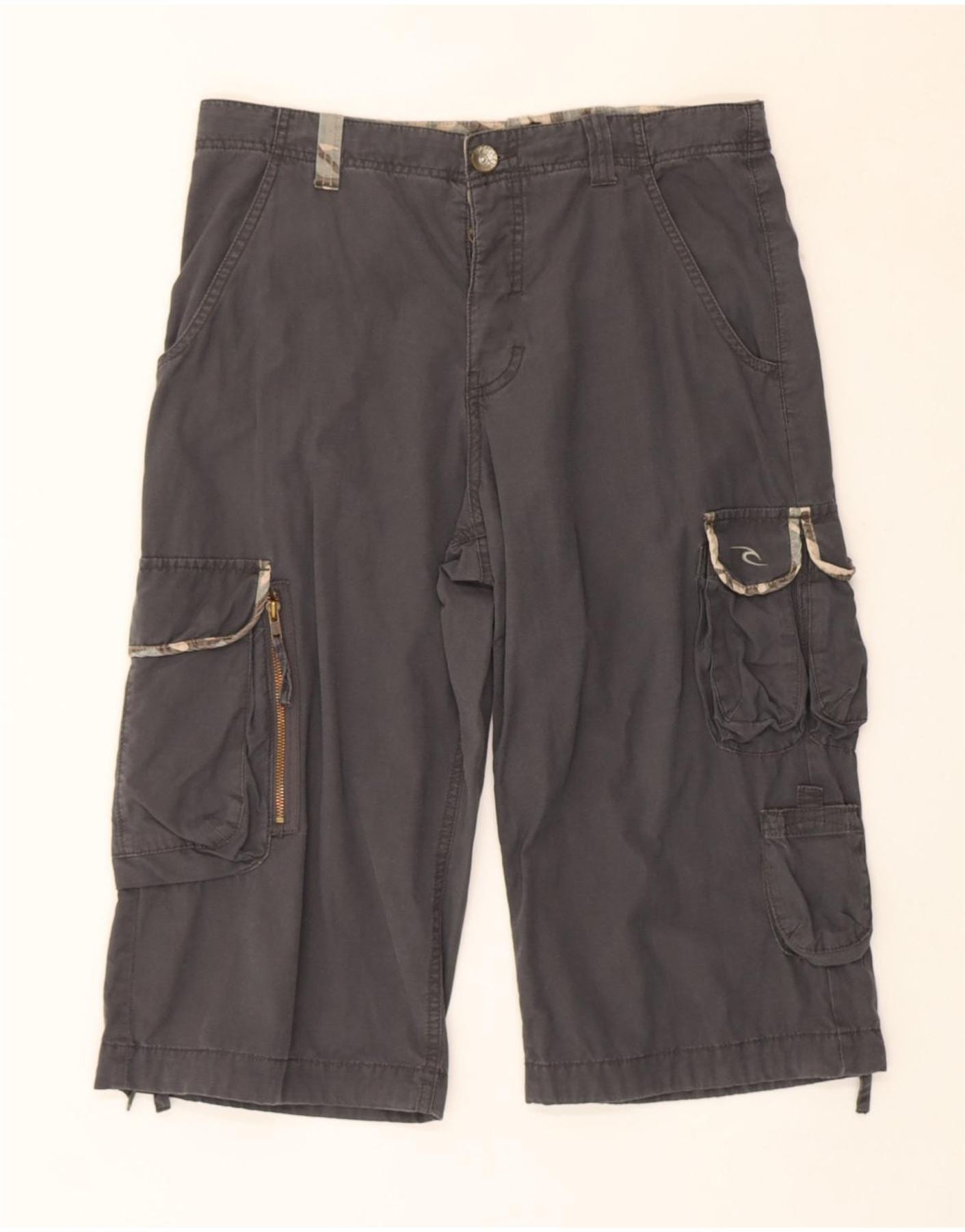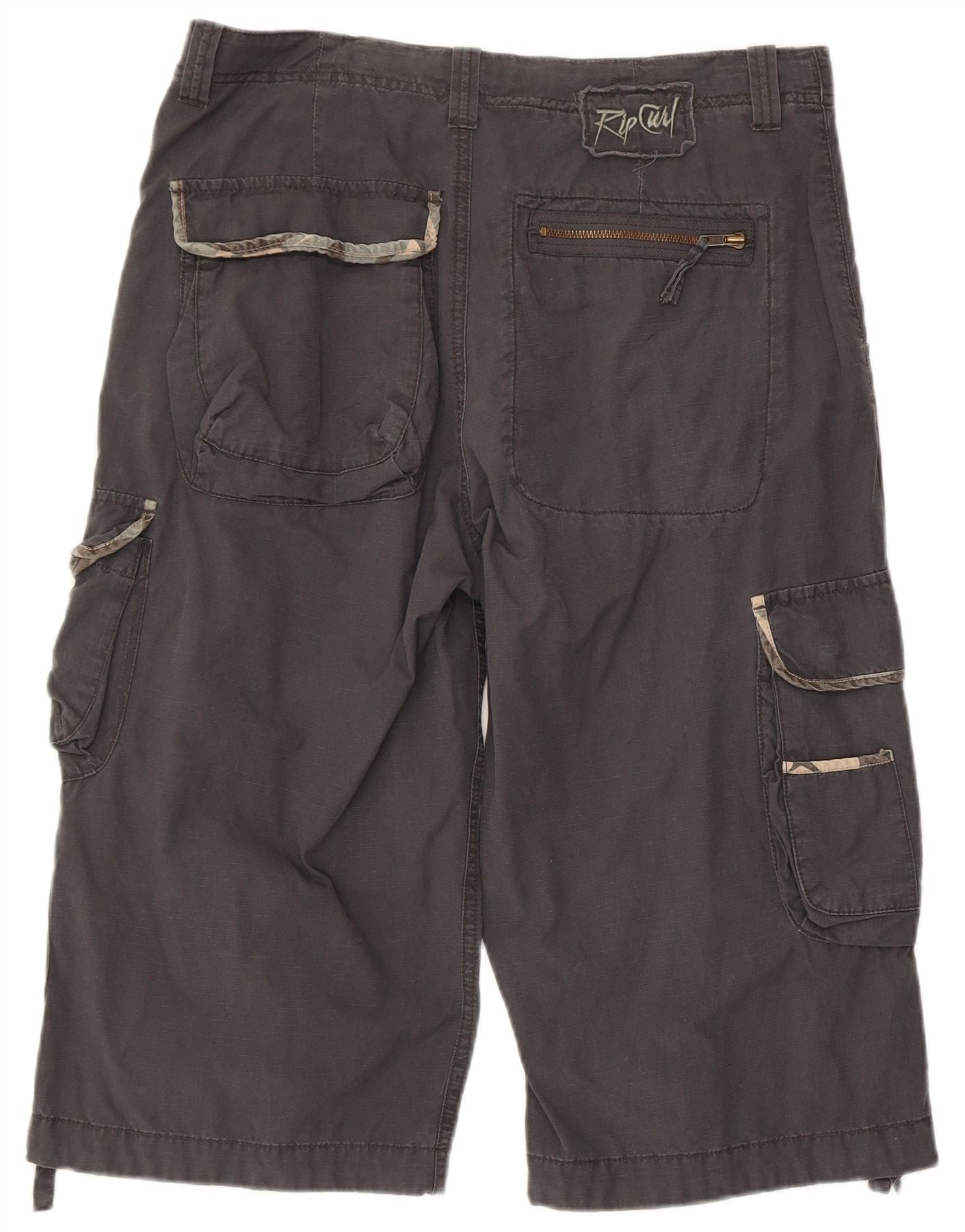 - AI Description: These Rip Curl mens Cargo Shorts are crafted from durable 100 percent cotton woven fabric. They feature a relaxed fit, ideal for comfort and movement. A button and zip closure secures the waist. The grey camo pattern gives an army inspired style. Multiple pockets, including zipped pockets, offer practical utility.