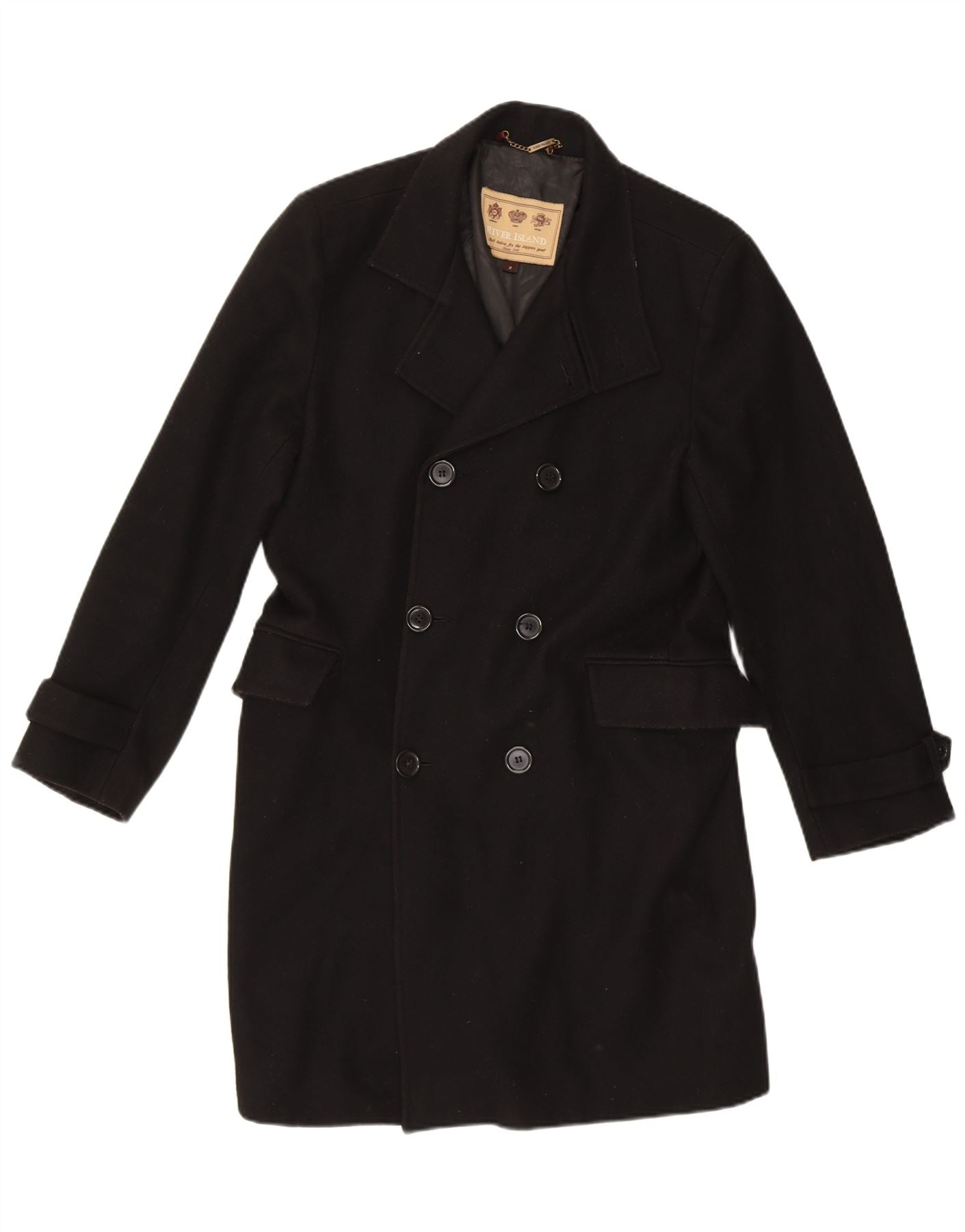RIVER ISLAND Mens Double Breasted Coat UK 38 Medium Black Wool