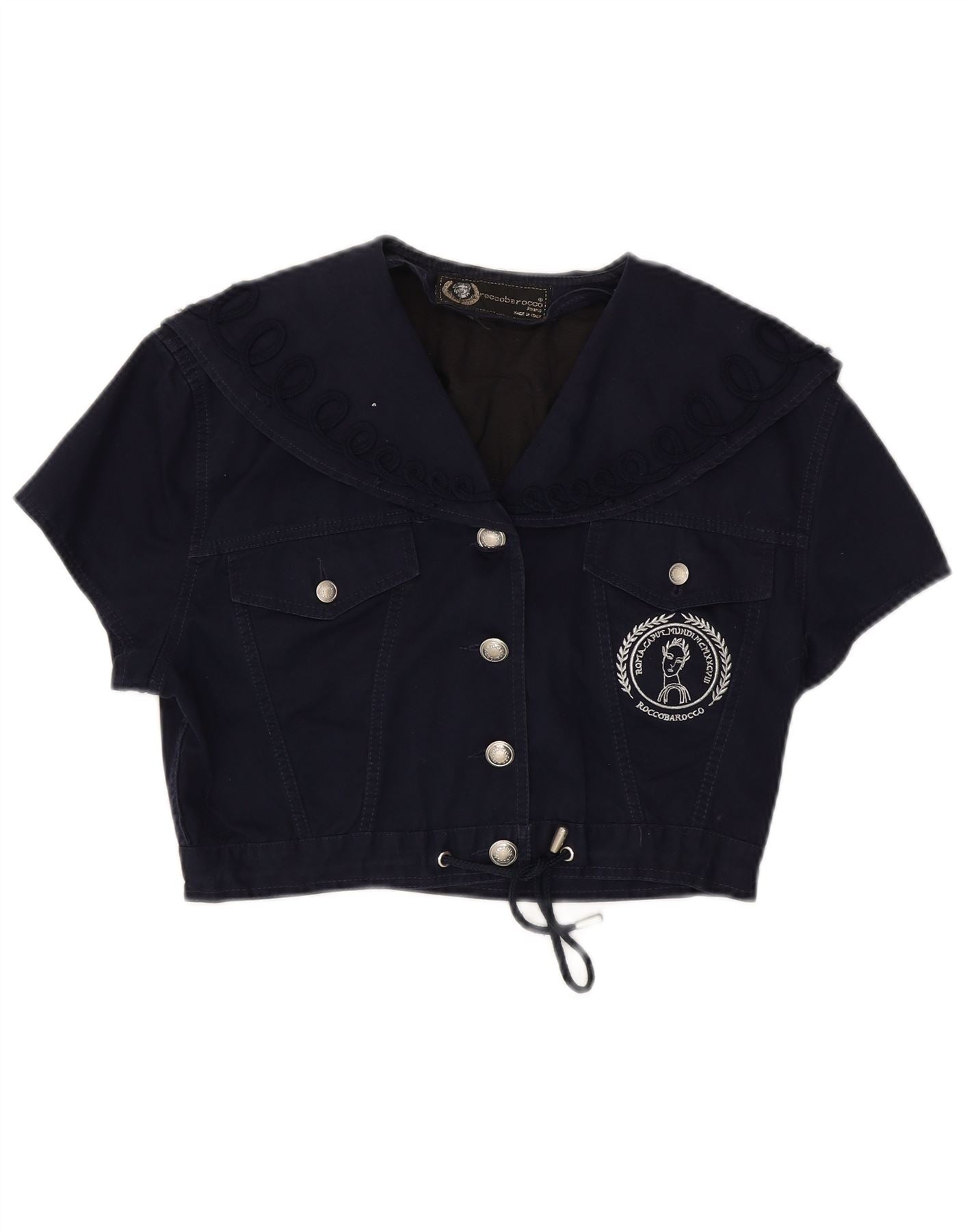 - Descripción de IA: Esta chaqueta vaquera para mujer de Roccobarocco está confeccionada con 100 % algodón en un intenso azul marino. Presenta un distintivo escote con cuello de estilo náutico marinero. Las mangas cortas y el largo recortado le dan una silueta moderna. El cierre de botones y los bolsillos delanteros añaden detalles prácticos. Una cintura ajustable permite un ajuste personalizado. Un destacado logotipo realza esta elegante pieza.