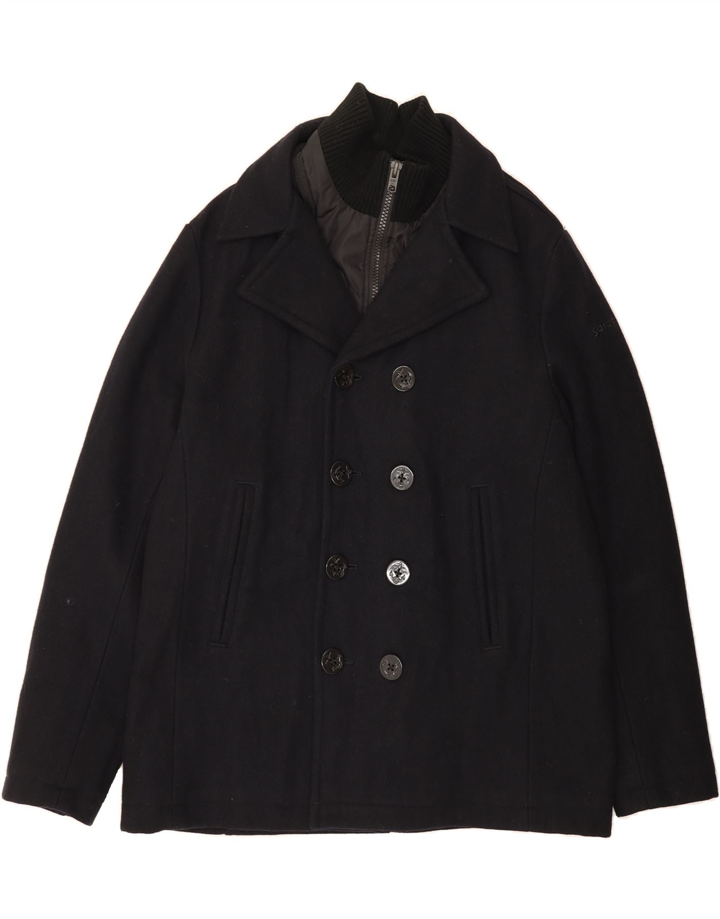 - AI Description: A classic men's pea coat from Schott in black tweed. Crafted from a durable wool blend (80% wool, 20% nylon/polyester) and fully lined for warmth. This double-breasted coat features a regular fit, long sleeves, and a collared neckline. It has a button closure and practical pockets. In pre-owned excellent condition, reflecting the quality of this New York City heritage brand. A timeless piece with a regular fit, ideal for any wardrobe.