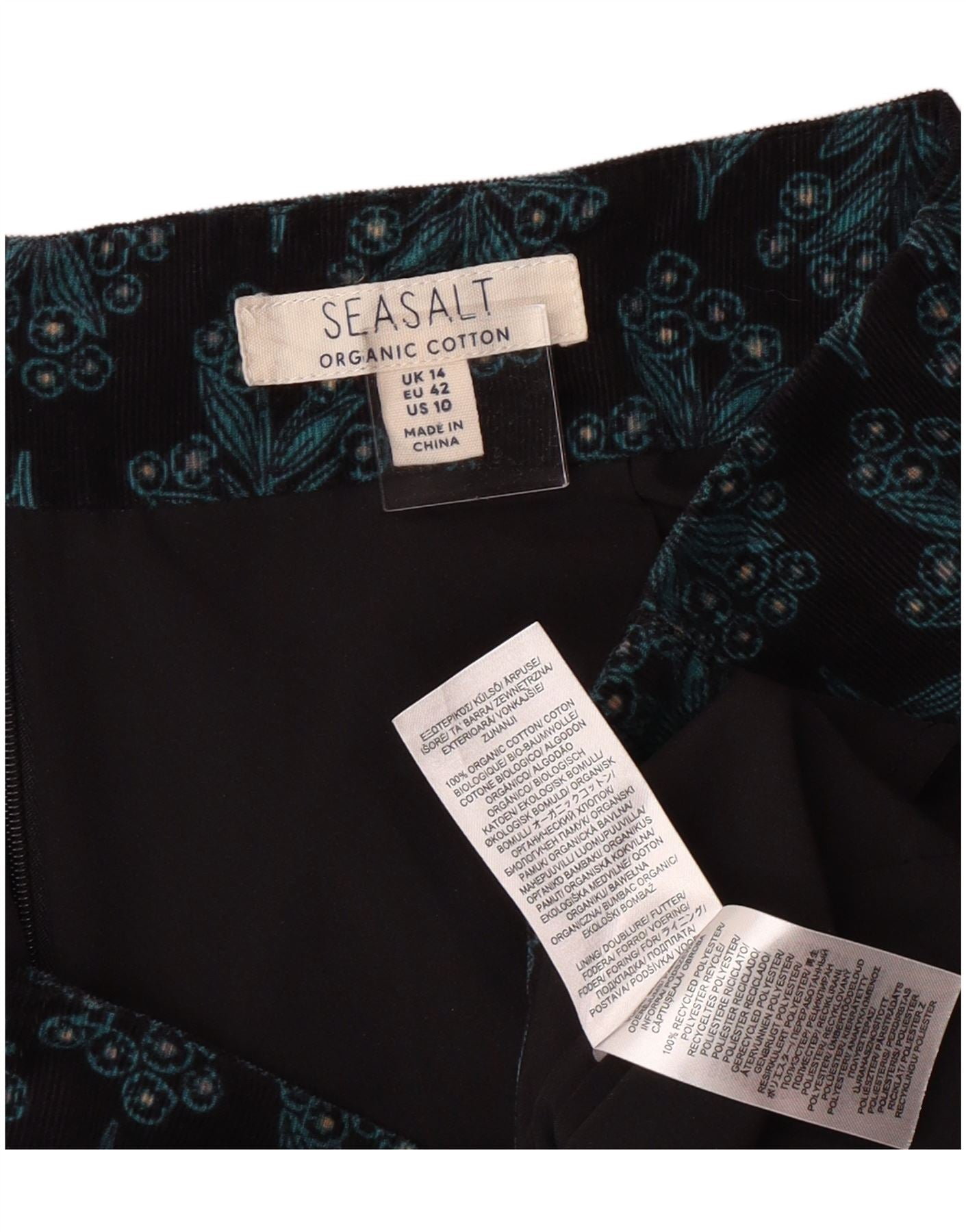- AI Description: This Seasalt women's mini skirt is crafted from soft organic cotton corduroy, offering a rich texture. It features a subtle floral pattern against a deep black background. The regular fit and mini length create a modern silhouette. A discreet zip closure ensures a smooth finish. Fully lined for comfort and a premium feel.