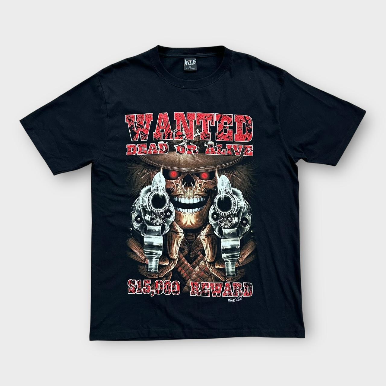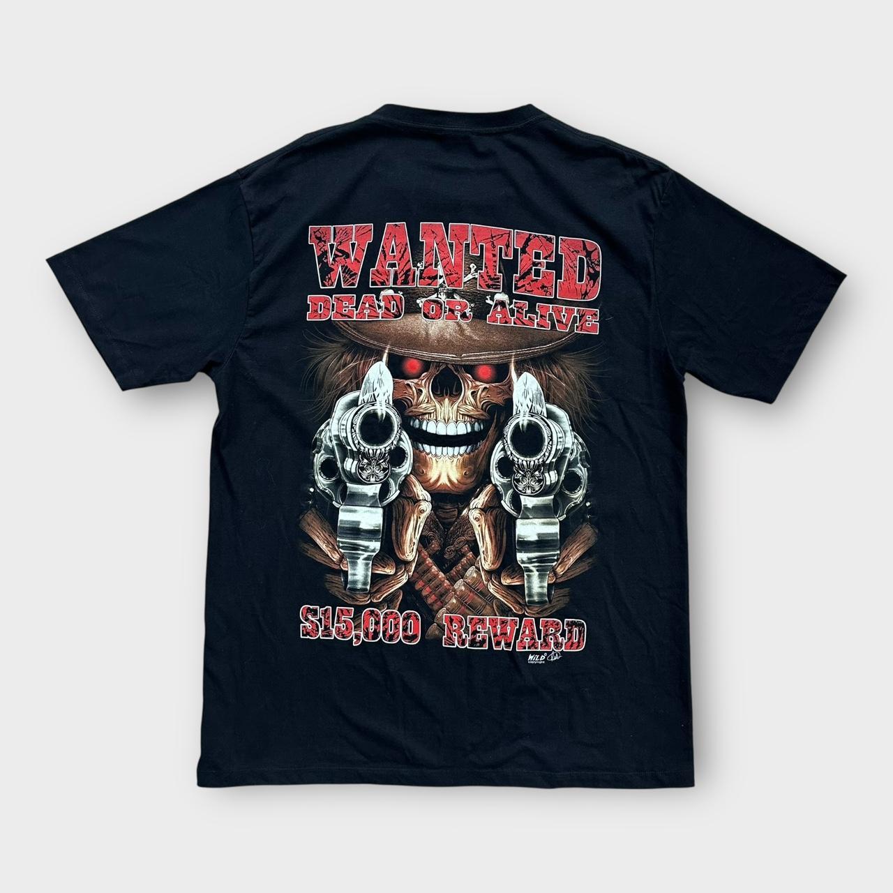 Camiseta con gráfico de calavera de principios de 2000 "Se busca vivo o muerto" con estampado en el pecho y la espalda en una etiqueta comodín. También tiene detalles metálicos en el frente.
