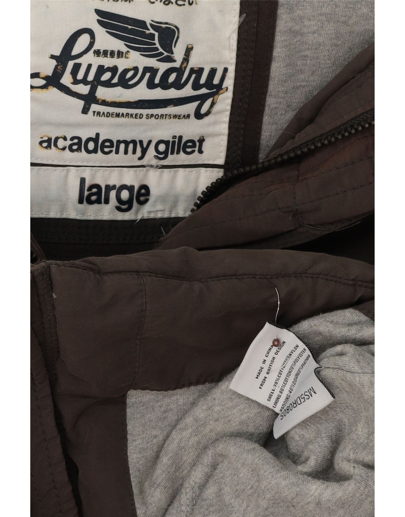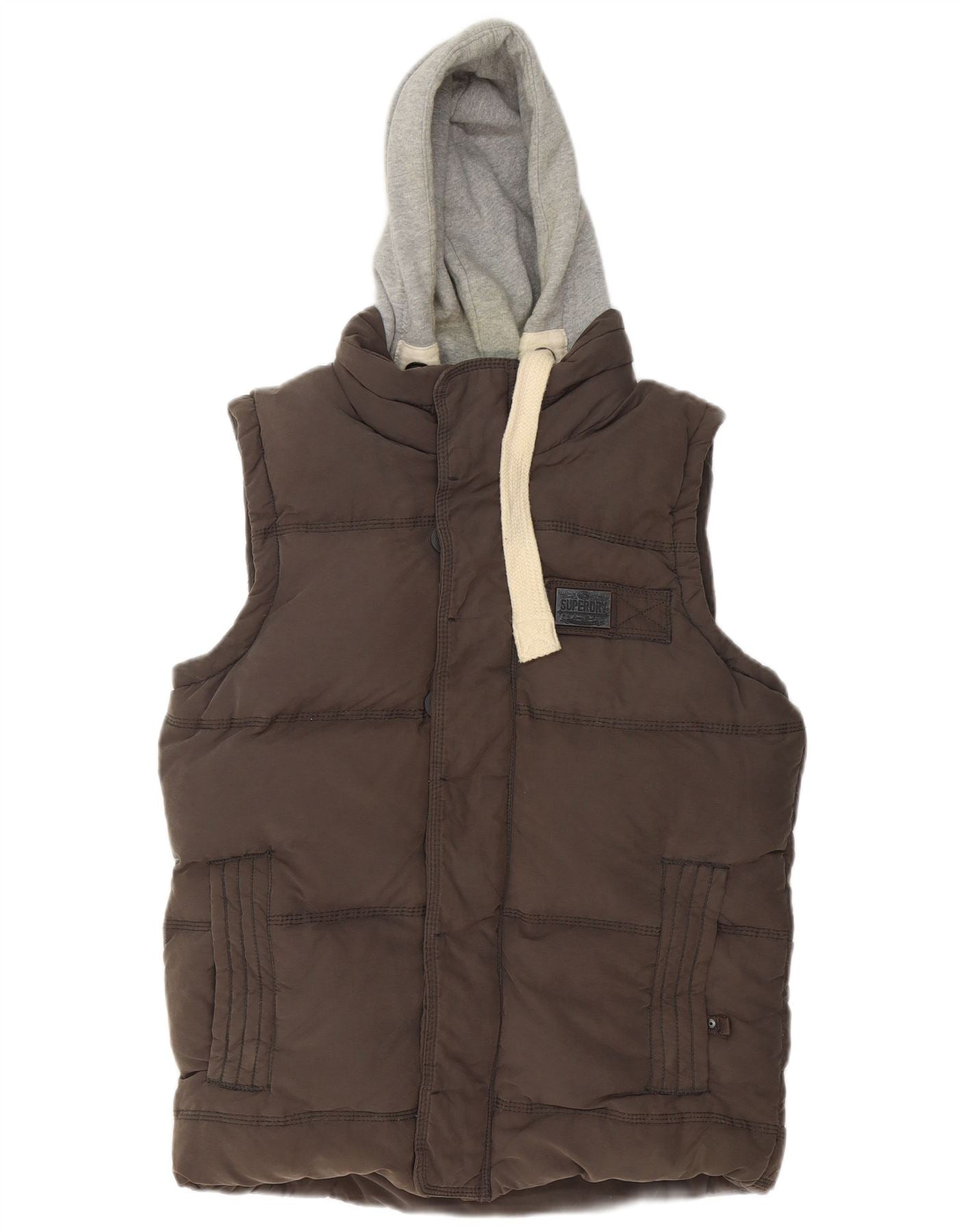 - AI Description: This Superdry men's padded gilet is crafted from a durable cotton blend, featuring a quilted texture. Its brown hue offers versatile styling. The sleeveless design and high neck provide warmth without bulk. A full zip closure ensures easy wear. It includes a practical hood and useful pockets. The regular fit offers comfortable layering. A subtle logo detail completes this classic piece.
