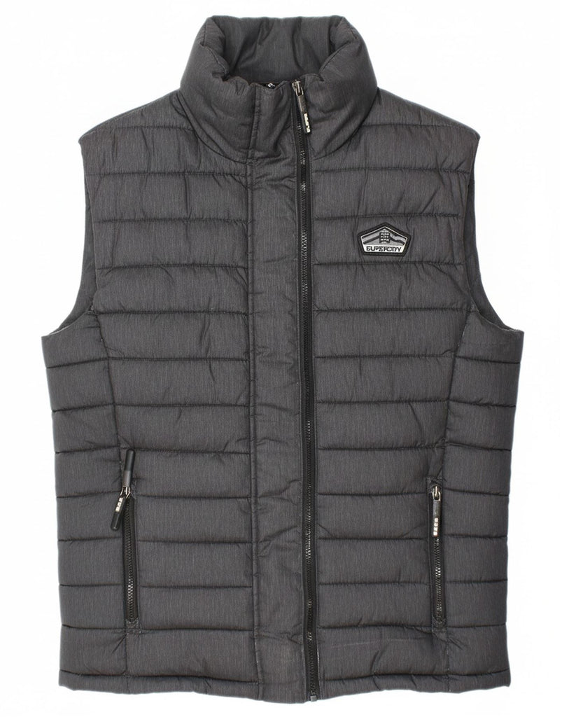 - AI Description: This Superdry men's waistcoat features a classic, quilted design in grey woven fabric. The regular fit ensures comfort and ease of movement. It has a collared neckline and a full zip closure. Zipped pockets offer secure storage. The padded construction provides extra warmth. A logo accent adds a signature touch. This sleeveless waistcoat is both practical and stylish.