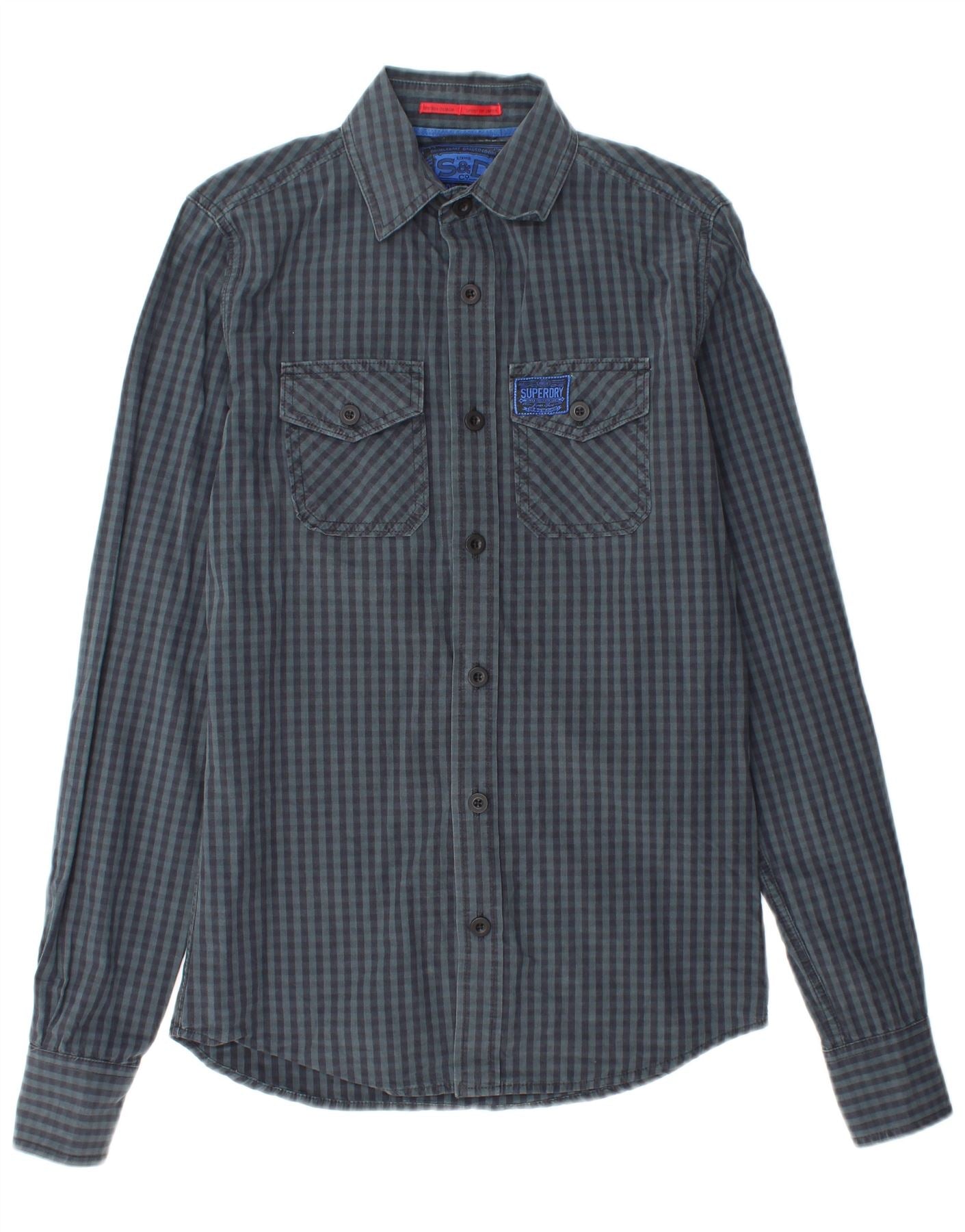 SUPERDRY Camisa de hombre pequeña de algodón a cuadros azul marino