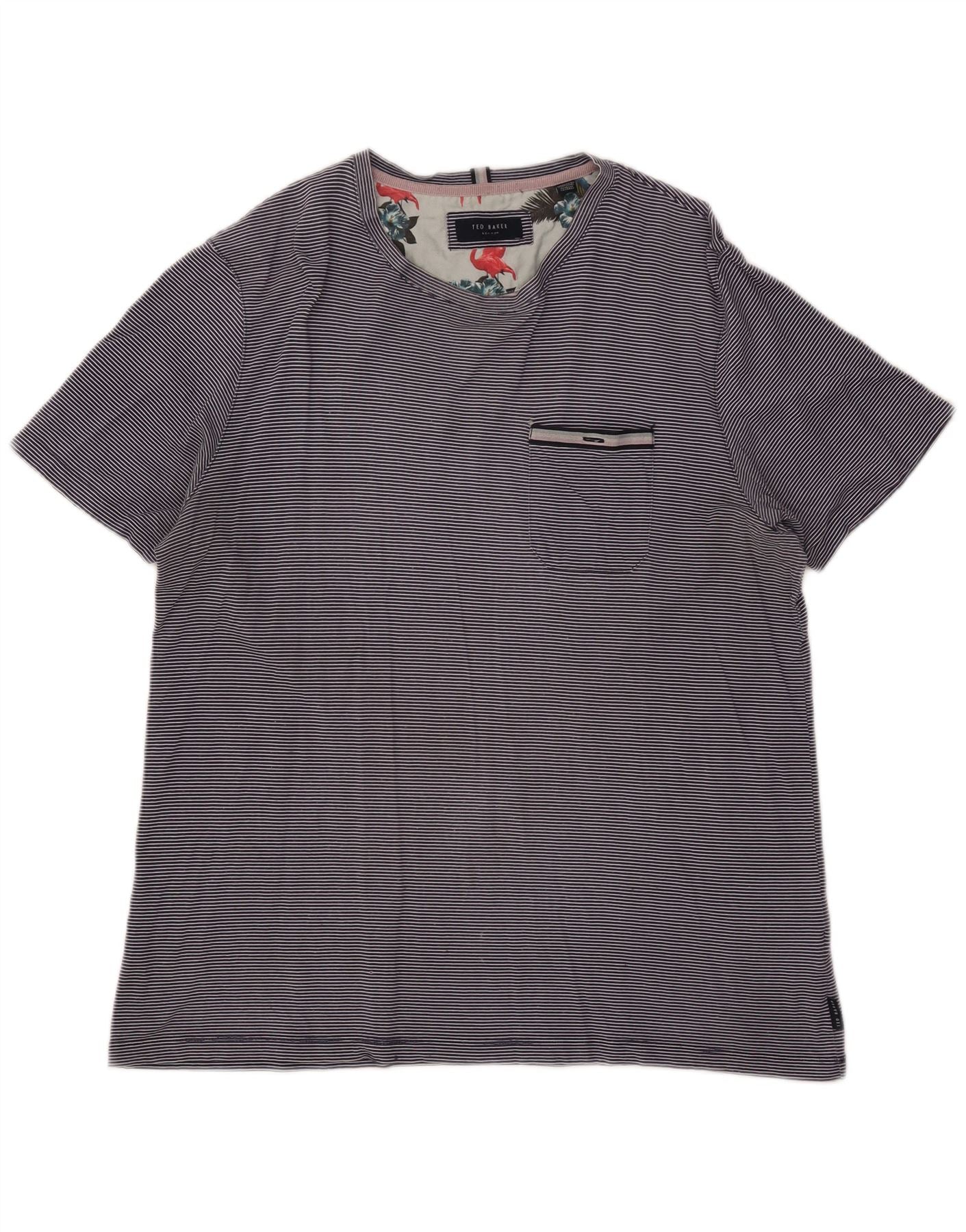 - Descripción de IA: Esta camiseta para hombre de Ted Baker está confeccionada con un suave punto de algodón gris que ofrece una sensación de comodidad. Presenta un sutil patrón de rayas en todas partes. Un bolsillo en el pecho añade un detalle práctico. El cuello redondo y las mangas cortas crean una silueta clásica. Su corte regular garantiza comodidad diaria. El interior del cuello presenta un estampado gráfico distintivo, un toque característico de Ted Baker.