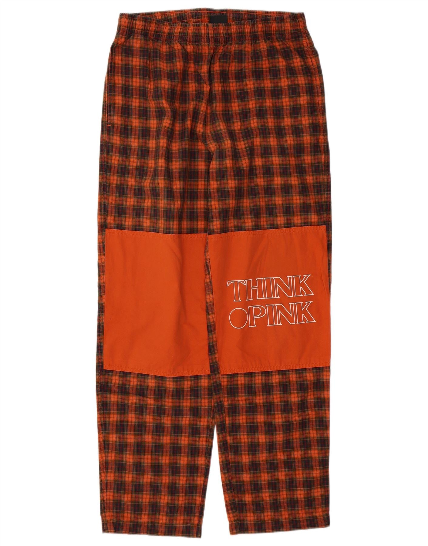 - Descripción de IA: Estos pantalones para hombre Think Pink están confeccionados 100 % con algodón tejido y ofrecen una sensación de comodidad. Presentan un patrón de cuadros de color naranja vibrante, que combina tonos de rojo y marrón. El ajuste relajado y el estilo sin cordones garantizan la facilidad de uso. Una cintura elástica proporciona comodidad. Se incluyen prácticos bolsillos. Un panel naranja distintivo en la pierna presenta un logotipo gráfico "Think Pink", que agrega un toque retro.