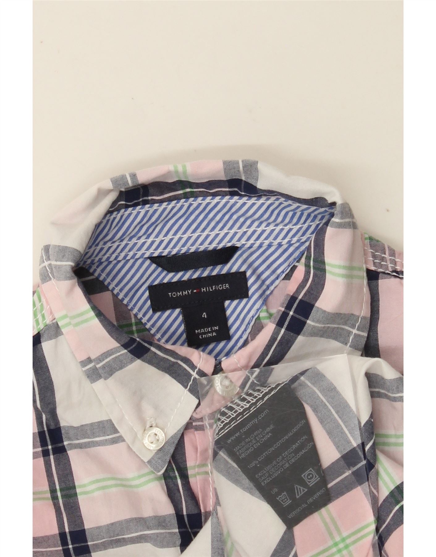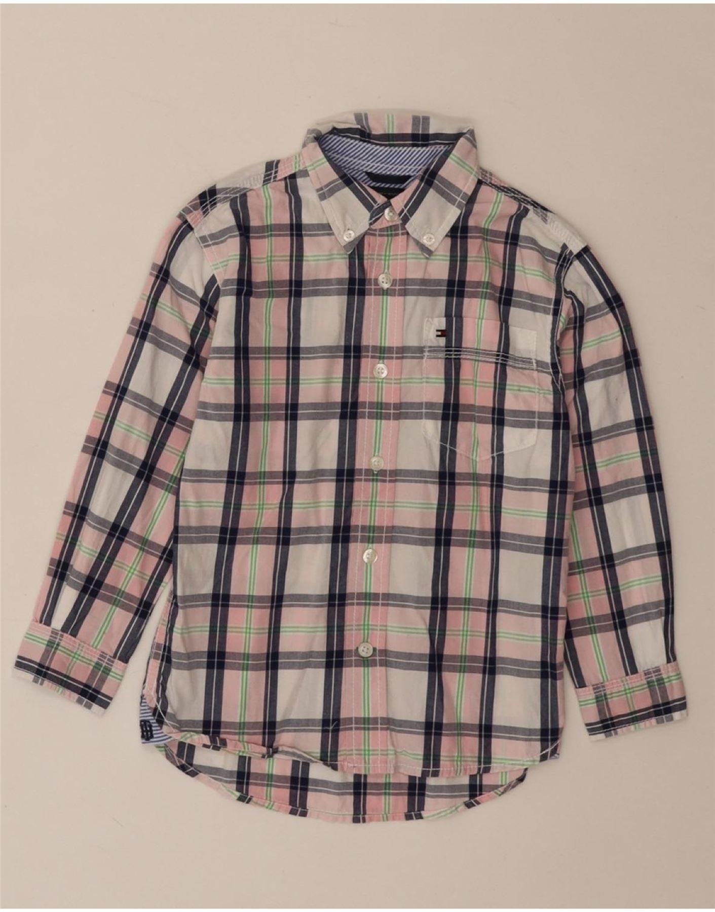 - AI Description: This Tommy Hilfiger boys' shirt is crafted from 100 percent woven cotton. It features a vibrant multicoloured plaid pattern. The collared neckline and button closure offer a classic look. Long sleeves and a regular fit ensure comfort and style. Practical pockets and a subtle logo accent complete the design.