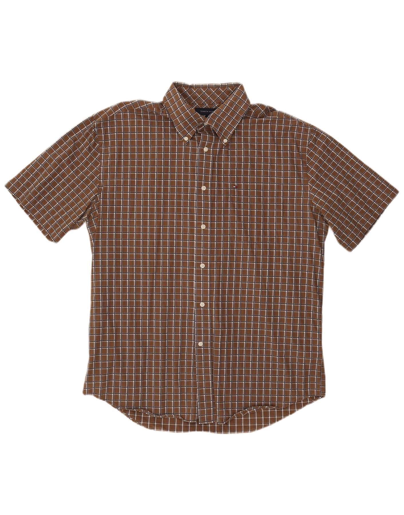 TOMMY HILFIGER Camisa de manga corta para hombre Large Brown Check Cotton