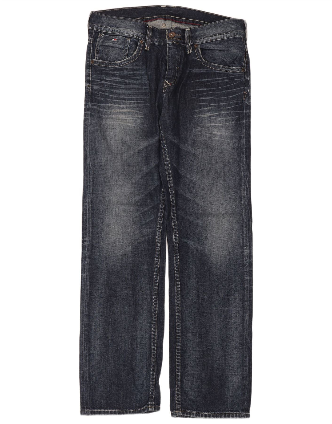 - Descripción de IA: Estos jeans rectos para hombre de Hilfiger Denim están confeccionados con mezclilla 100 % algodón en un intenso azul marino. Presentan una pierna recta clásica y un ajuste regular para mayor comodidad. El cierre de cremallera garantiza un ajuste seguro. Los sutiles detalles desgastados añaden un toque contemporáneo. Bolsillos funcionales y un logo de marca completan el diseño.