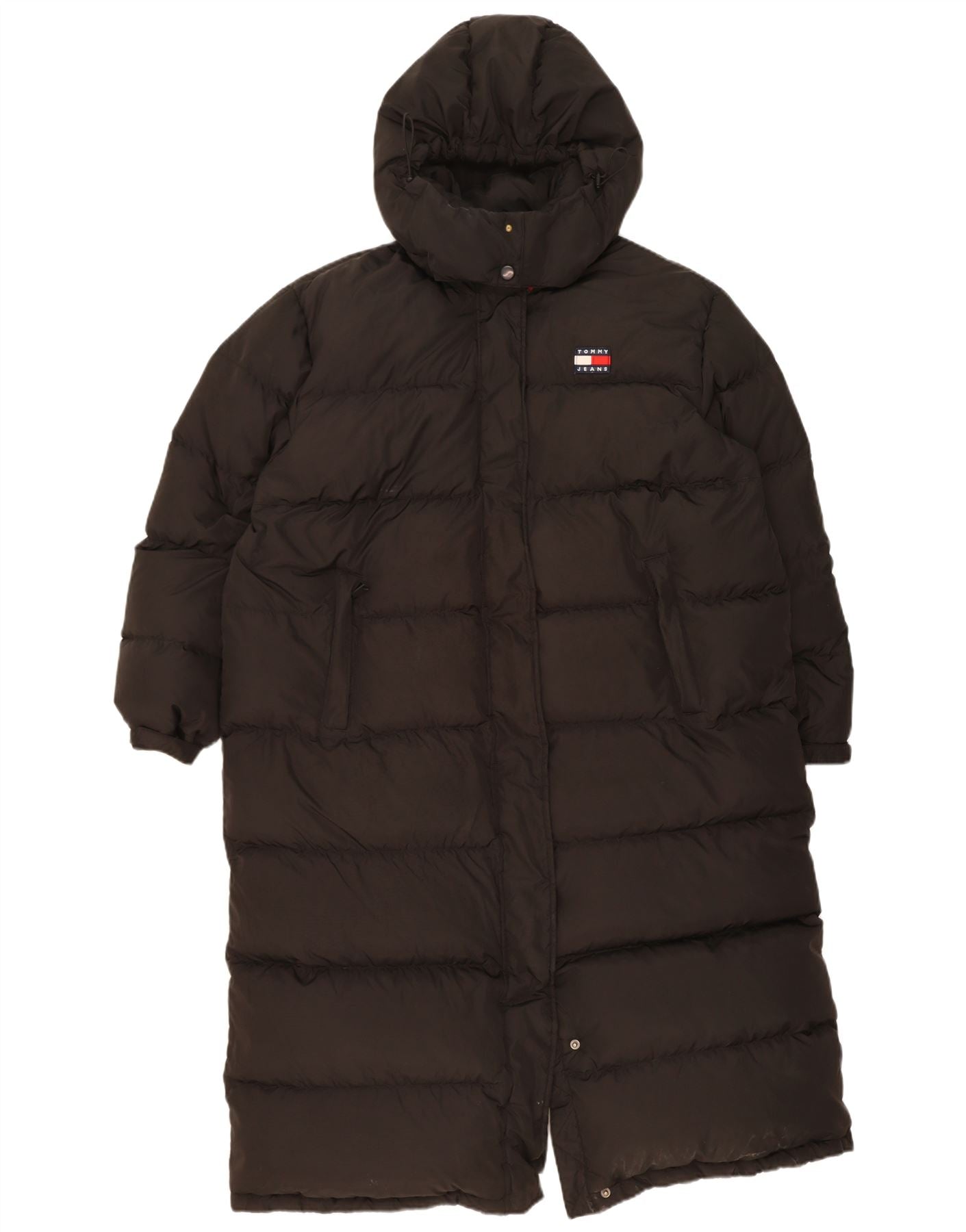 - AI Description: This Tommy Hilfiger women's padded coat is crafted from a luxurious black down blend, offering exceptional thermal warmth. Its oversized, relaxed fit provides ample coverage for winter. The full zip closure extends to a high neck, complementing the practical hooded design. Long sleeves ensure complete warmth. Multiple pockets offer functionality, and a subtle branded logo adds a signature touch.
