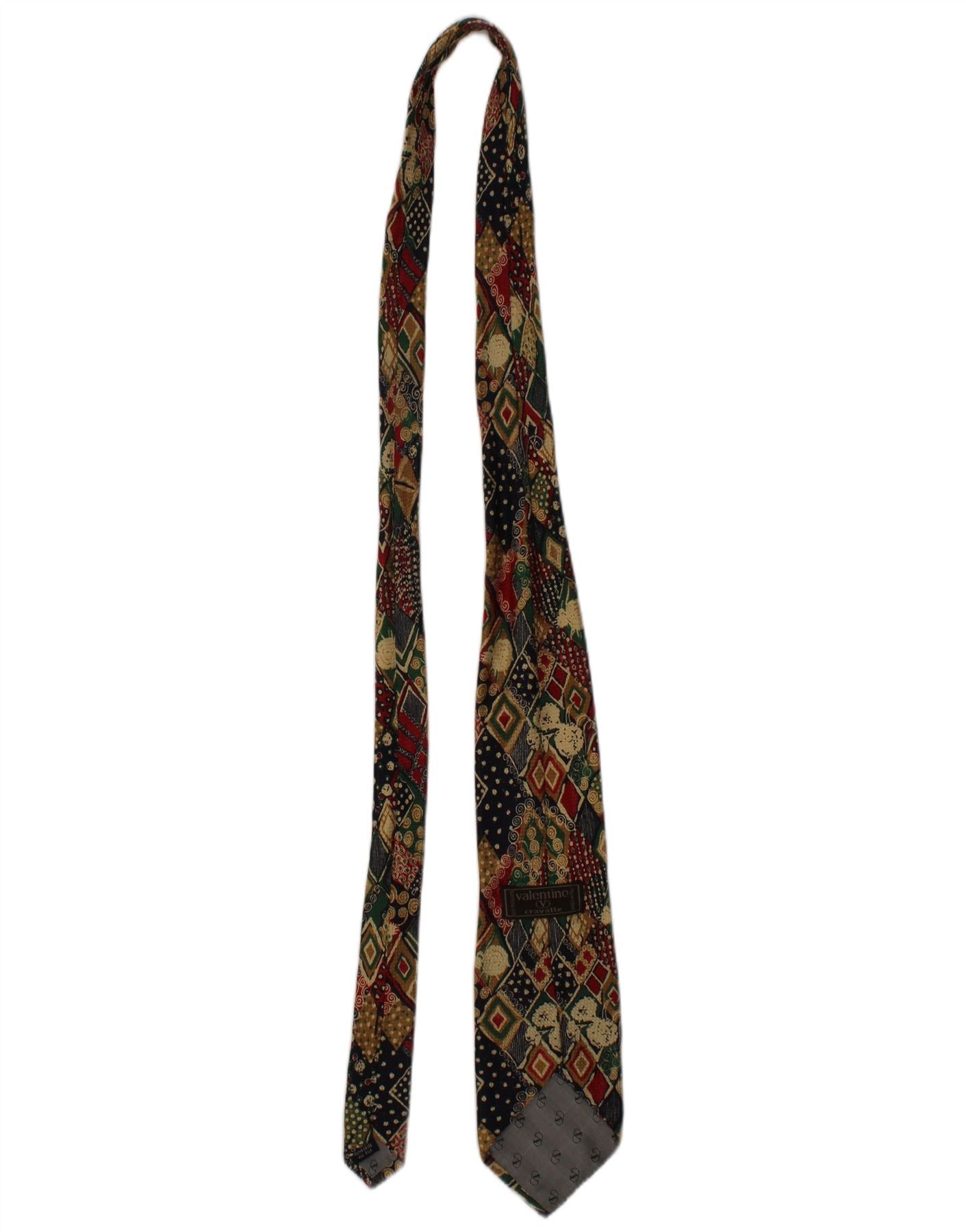 - AI Description: This Valentino mens tie is crafted from a finely woven fabric. It features a striking multicoloured geometric pattern, blending red, green, and navy blue hues. The classic fit ensures a timeless, elegant drape. Its structured design offers a refined finish. This accessory adds a sophisticated graphic touch to any formal ensemble.