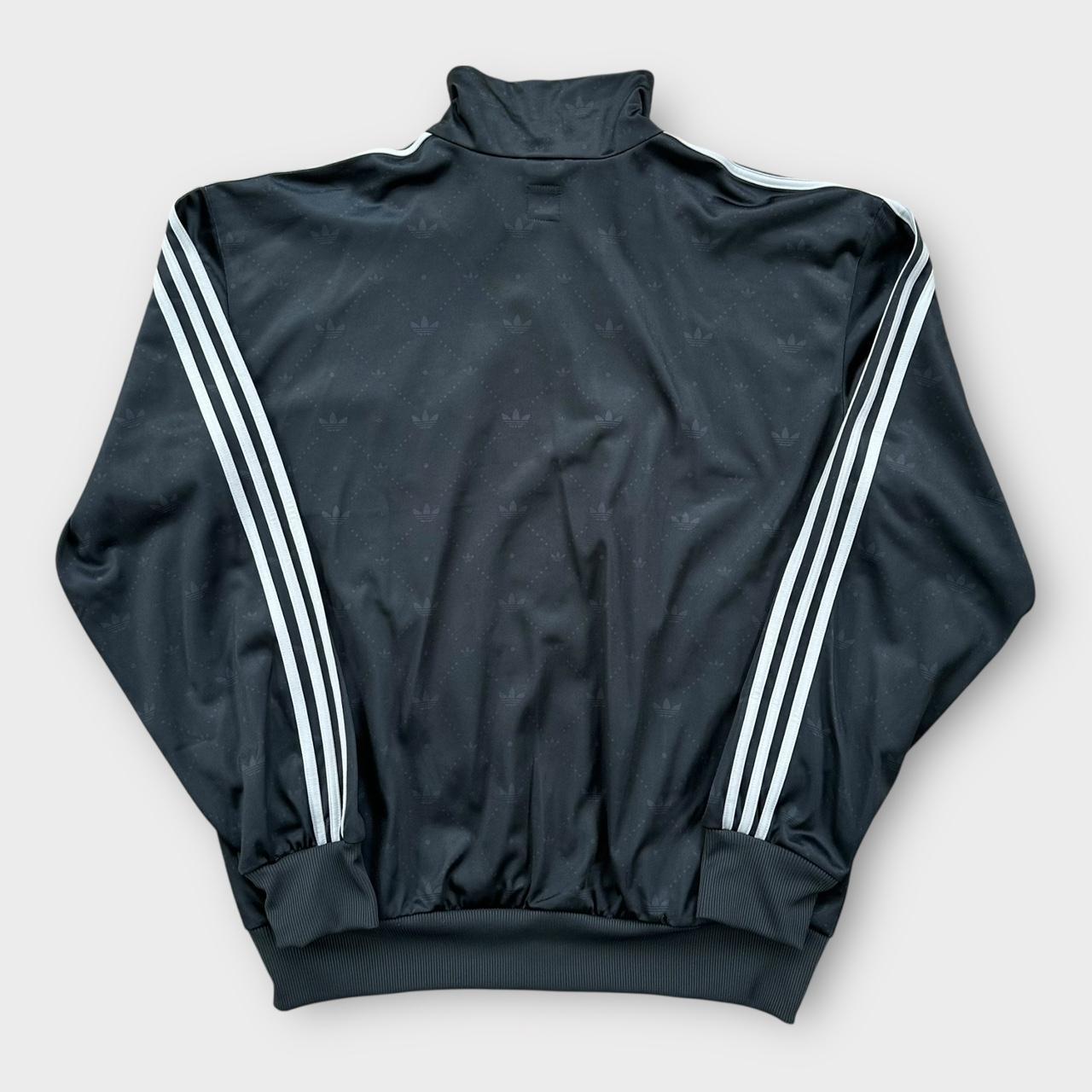 Chaqueta deportiva con cremallera de Adidas vintage de principios de 2000 con logo repetido en negro con rayas blancas en los brazos y logo bordado en el pecho.