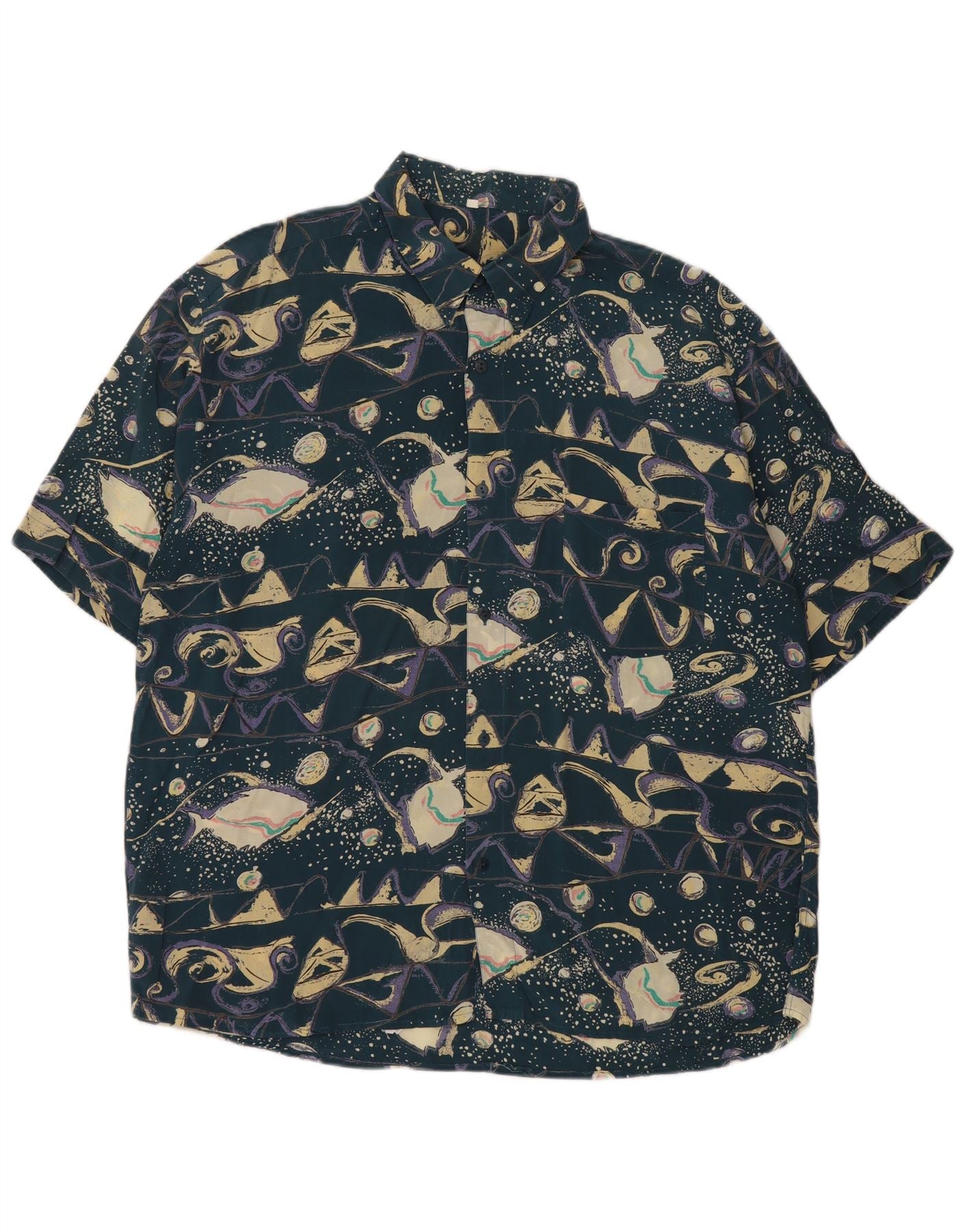Vintage hombres patrón abstracto camisa de manga corta XL azul viscosa retro