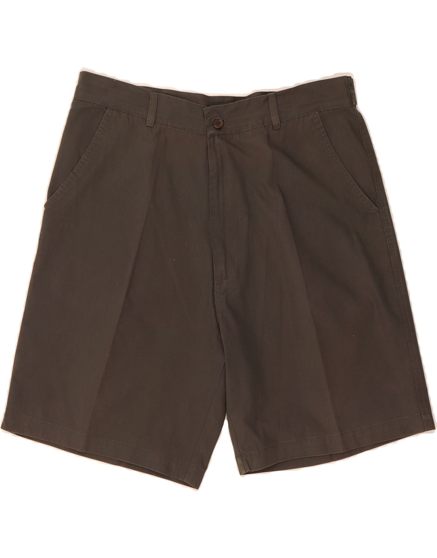 - AI Description: These vintage men's casual shorts in brown are a classic wardrobe staple. Crafted from a woven fabric blend of 65% polyester and 35% cotton, they offer a regular fit with an adjustable button waist. Features include practical pockets. The shorts are pre-owned and in excellent condition, with minor loose stitching on the waistband. Size 48.