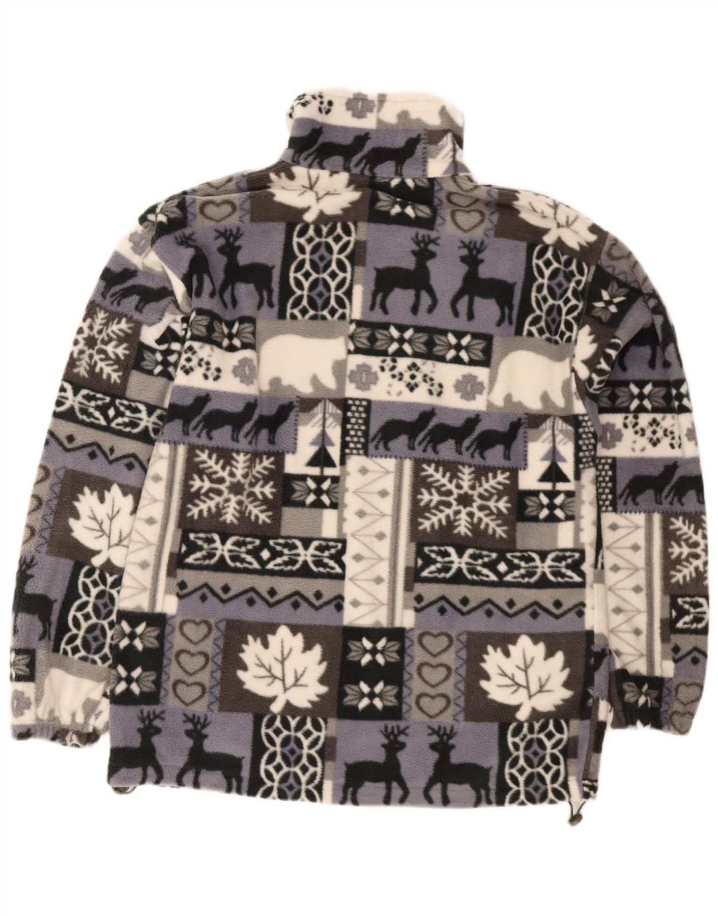 - Descripción de IA: Esta chaqueta polar Vintage para hombre está confeccionada con suave forro polar 100 % poliéster. Presenta un llamativo patrón de mosaico con elementos gráficos que incluyen ciervos, osos, copos de nieve y hojas en tonos grises, negros y blancos. El cuello alto y el cierre de cremallera completa ofrecen calidez y versatilidad. Las mangas largas y el corte regular garantizan una comodidad de uso. Incluye prácticos bolsillos y una cintura ajustable para una sensación de sastrería.